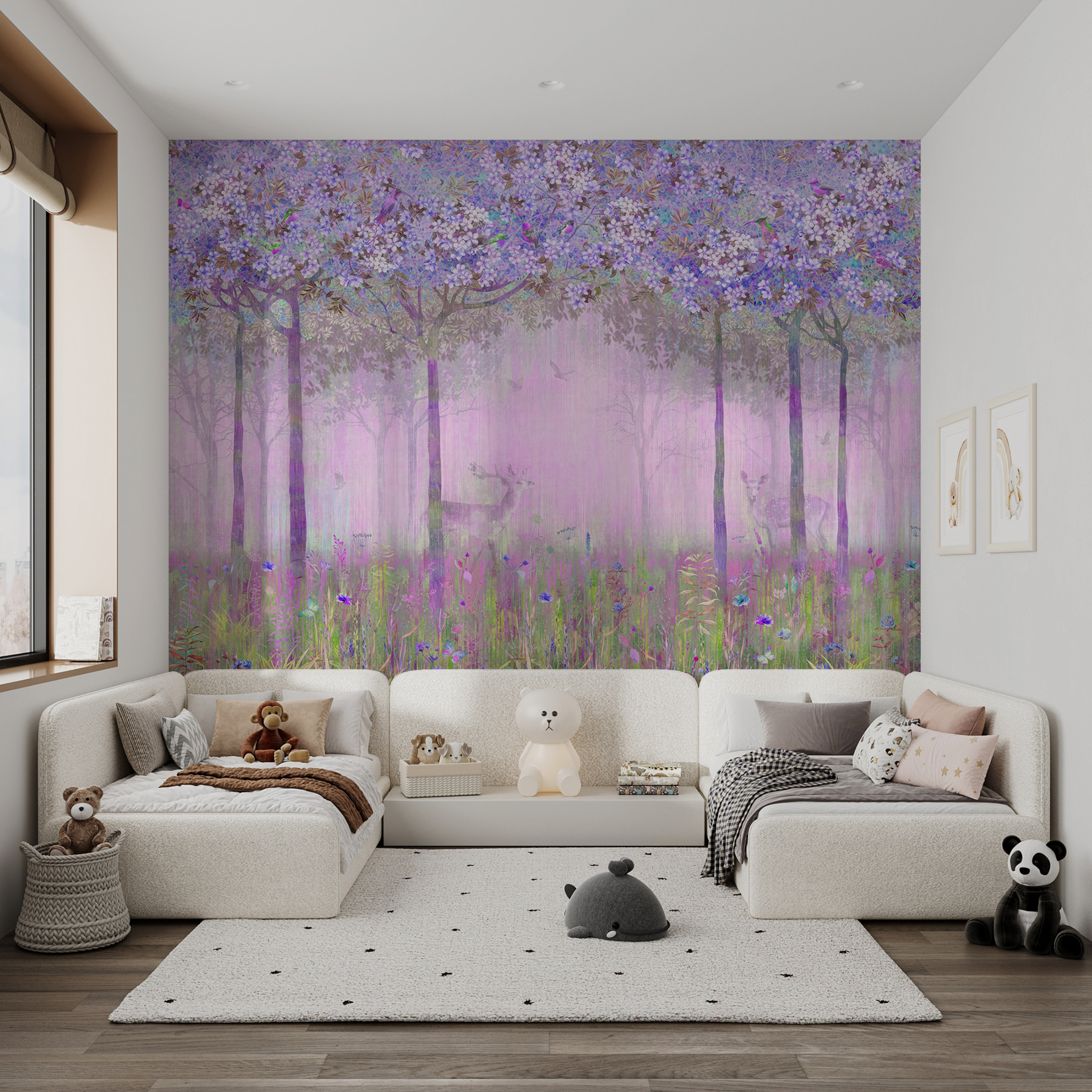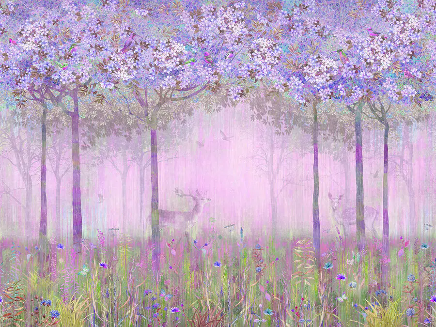 Se volete aggiungere un tocco di magia e di fantasia a una stanza, questo “Murales di fiori ed erba” è un sogno assoluto. Immaginate di entrare in un bosco da favola ogni volta che entrate nella stanza. Questo murale, inondato di tenui lavanda e verdi delicati, fa pensare a una serena mattina di primavera. Si può quasi sentire il sussurro delle foglie e vedere i cervi che fanno capolino attraverso la nebbia.