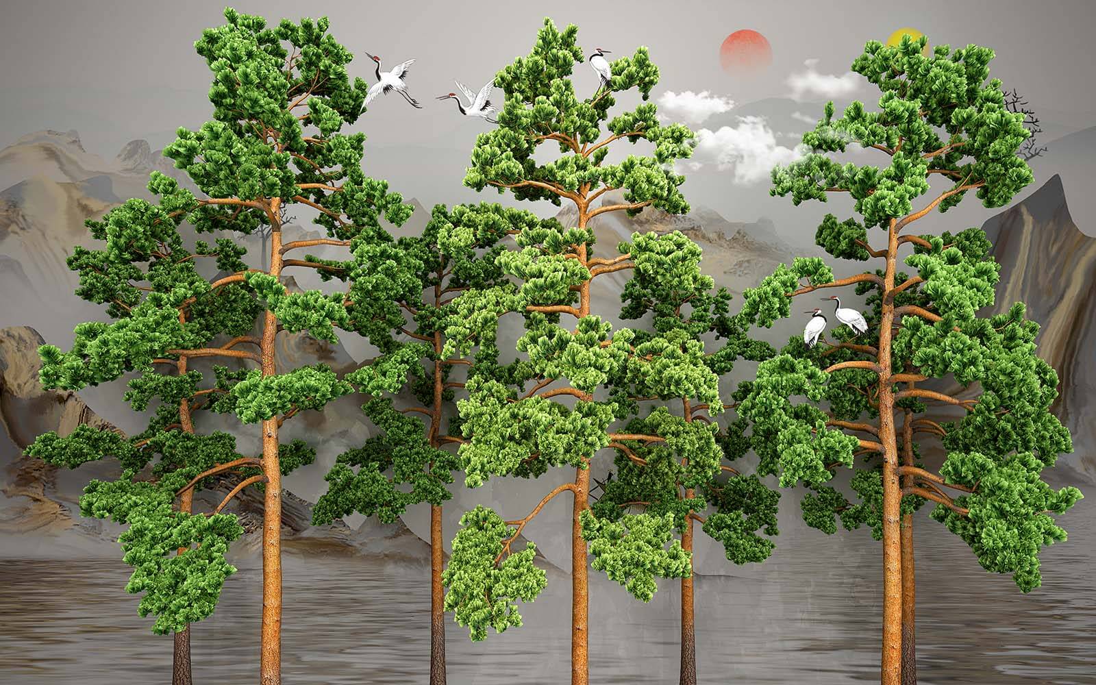Transform your space with this stunning wall mural featuring a tranquil grouping of trees, complete with graceful birds soaring above. It’s like stepping into a serene forest without leaving your living room—who needs a hiking trip? Imagine hosting friends and their jaws dropping at this unique backdrop. The vibrant greens pop against a softly muted background, making it a perfect fit for cozy corner nooks or even bold statement walls. Plus, those birds? They add a whimsical touch of freedom. Feel the calm wash over you every time you walk by; it’s like a little slice of nature right at home.
