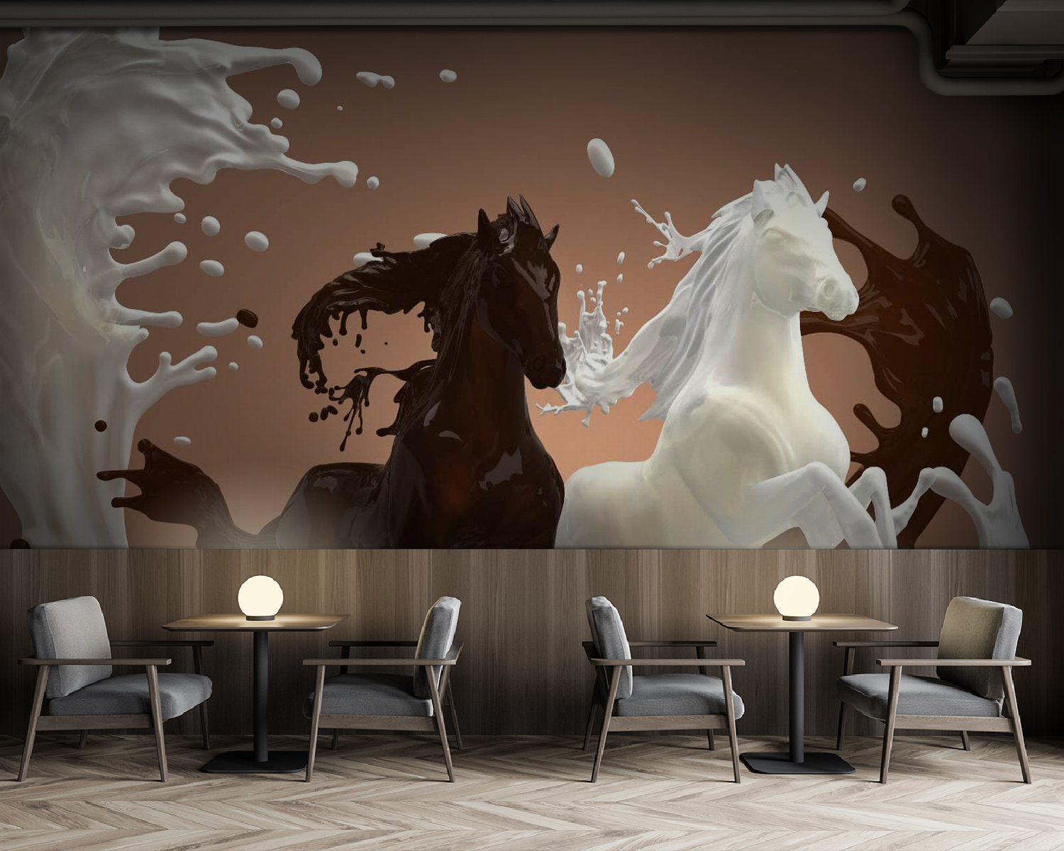 Immergiti in un tocco di fantasia con il “Murale Cavallo con latte che gli schizza intorno”. Immagina due splendidi cavalli, uno scuro e uno chiaro, che galoppano attraverso un abisso cremoso come se fossero impegnati in una gara epica. Non è solo un murale, è una dichiarazione.