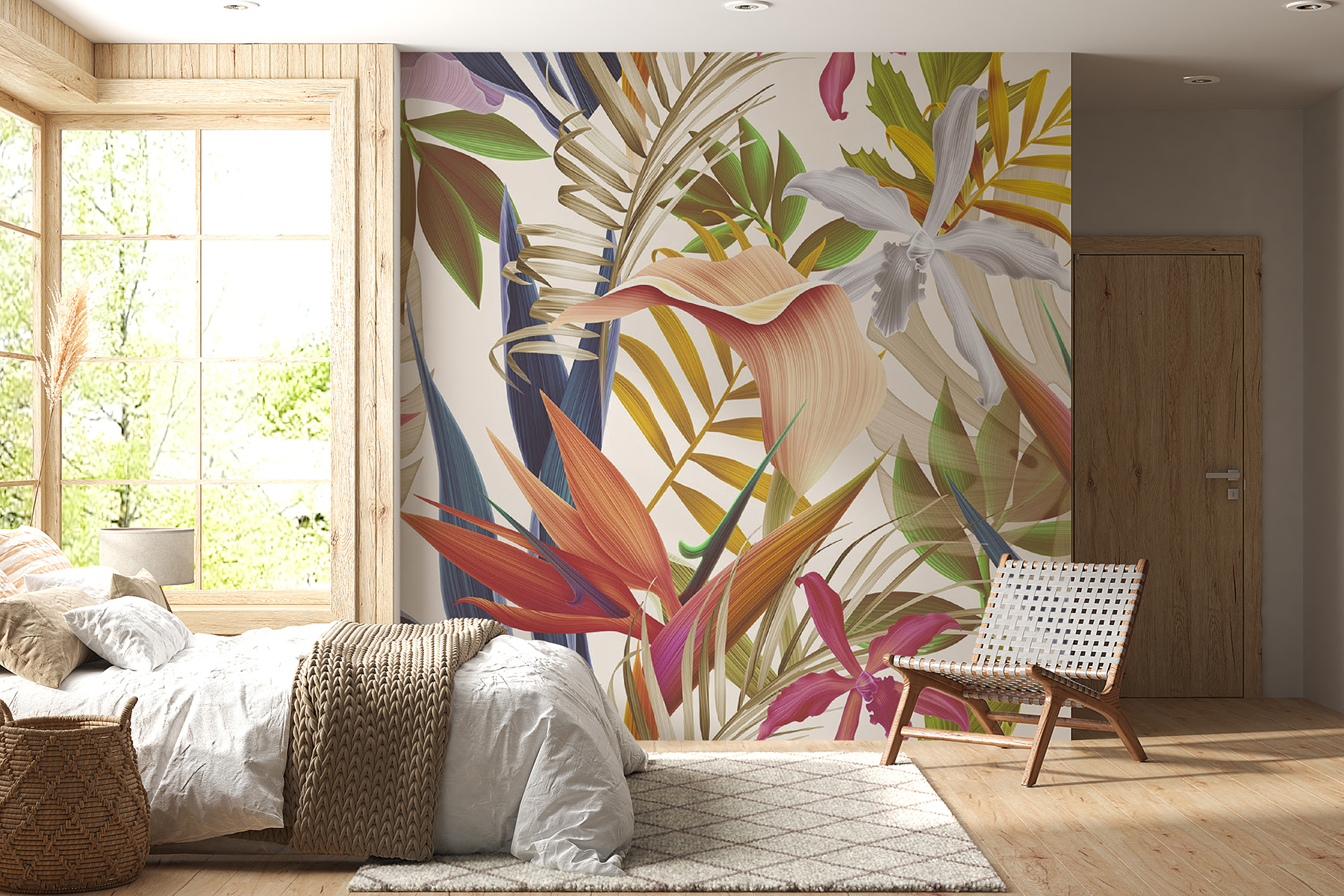 Trasformate qualsiasi stanza in un paradiso vibrante con questo splendido murale di foglie e fiori tropicali colorati. Immaginate di entrare nel vostro spazio e di sentirvi come se foste appena entrati in un giardino lussureggiante. Le ricche tonalità risaltano su qualsiasi sfondo, creando un’atmosfera invitante a cui è difficile resistere.