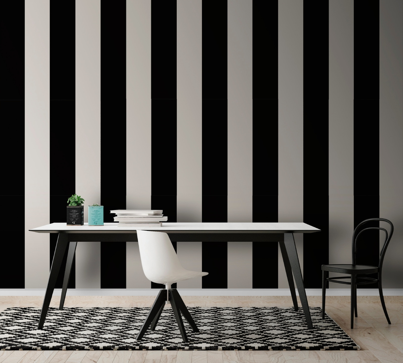 Transform any space with this striking black and white striped mural! It’s like wearing your favorite outfit but for your walls—sophisticated yet playful. Those bold stripes grab attention, making a space feel modern and dynamic, perfect for sparking conversations or simply giving your room that “wow” factor. Imagine sipping coffee, gazing at this mural, and feeling inspired. It’s not just decor; it’s a mood booster. You can almost hear the stripes whispering, “Hey, look at me!” Ideal for living rooms, offices, or any nook that craves a little character.