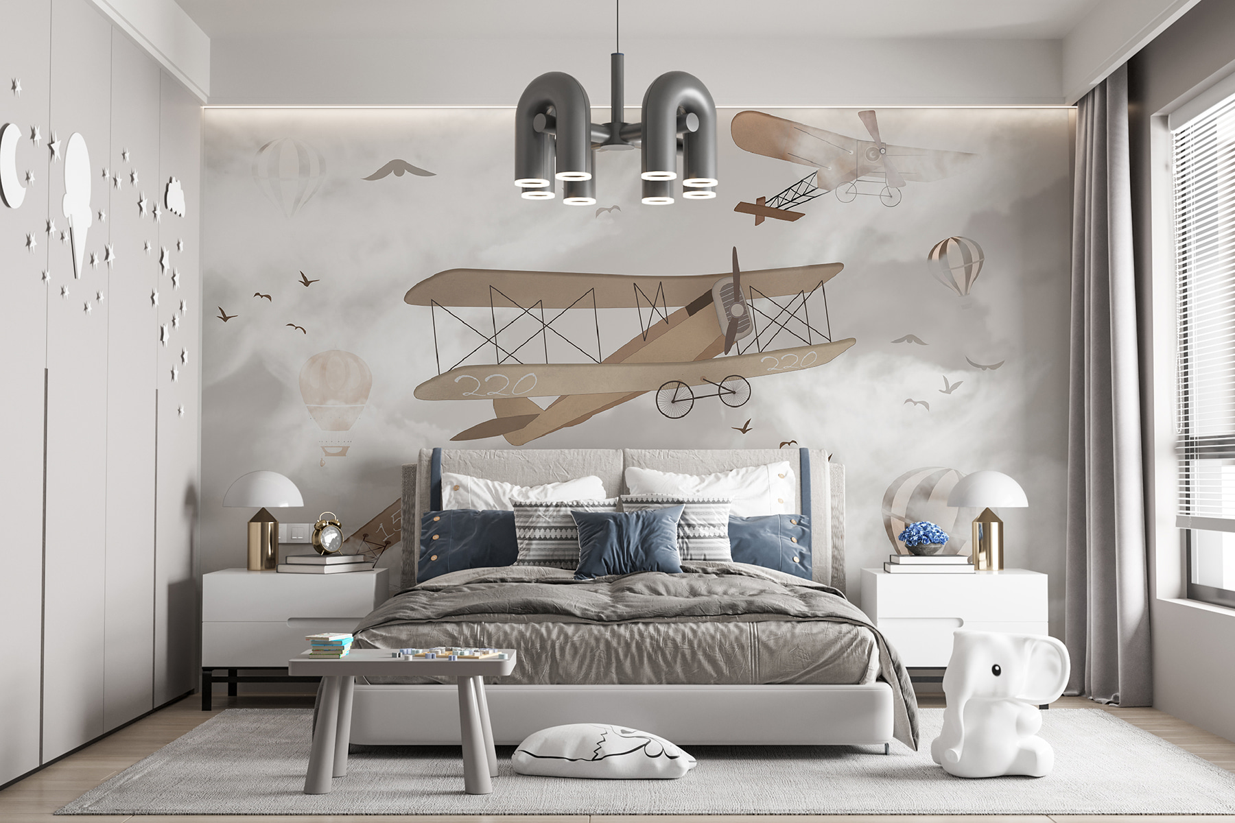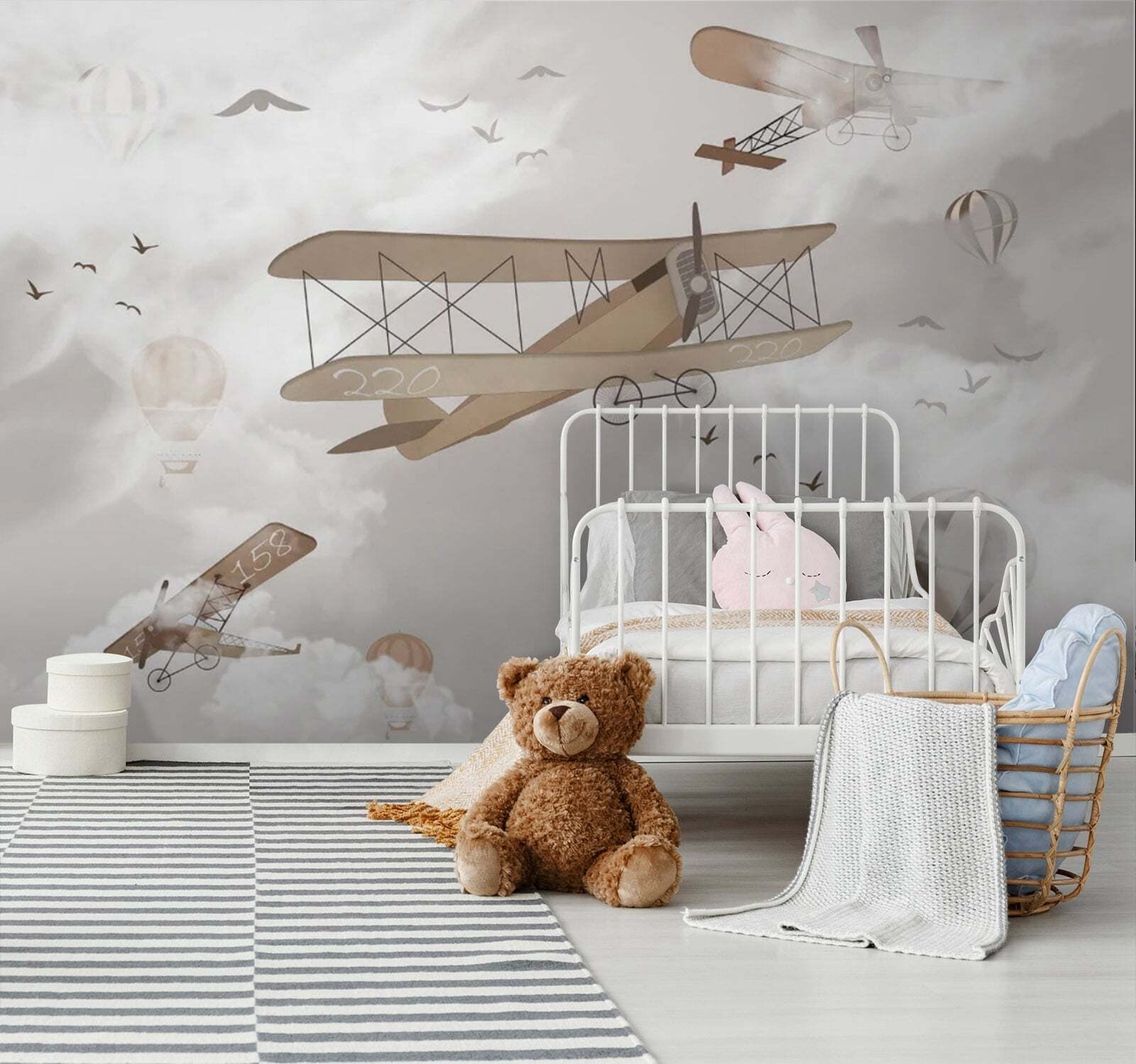 Immaginate di volare in alto sopra le nuvole con questo incantevole murale, “Mongolfiera nel cielo”. Perfetto per le camere dei bambini o di chiunque abbia un cuore giovane, questo murale dal design stravagante presenta mongolfiere e aerei d’epoca che danzano tra le nuvole: un vero sogno! Immaginate di svegliarvi ogni giorno con questa scena, come se foste in un’avventura senza fine.