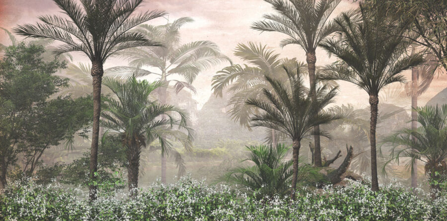 Murale “Mattinata serena in un paradiso tropicale”: non è forse invitante questo nome? Immaginate di svegliarvi con questa scena di pace, proprio nel vostro salotto. Verdi vivaci, fiori delicati e palme imponenti, il tutto avvolto da una soffice nebbia mattutina. È come entrare nella vostra giungla privata, senza lasciare il divano.