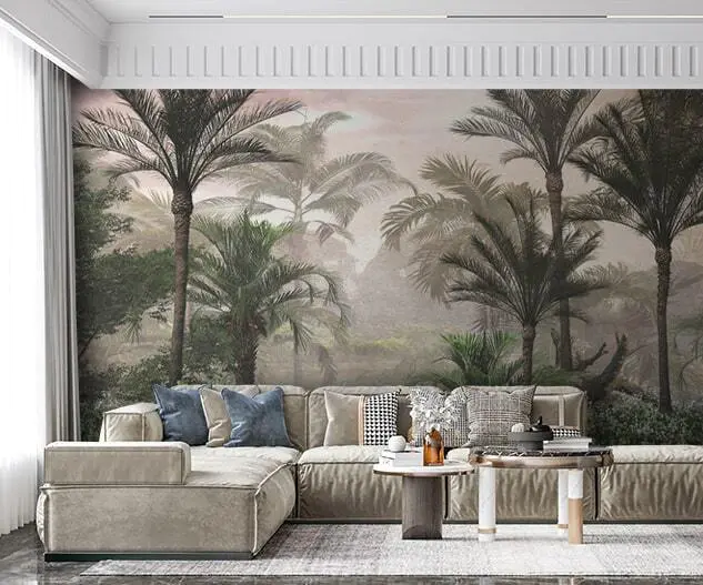 Murale “Mattinata serena in un paradiso tropicale”: non è forse invitante questo nome? Immaginate di svegliarvi con questa scena di pace, proprio nel vostro salotto. Verdi vivaci, fiori delicati e palme imponenti, il tutto avvolto da una soffice nebbia mattutina. È come entrare nella vostra giungla privata, senza lasciare il divano.