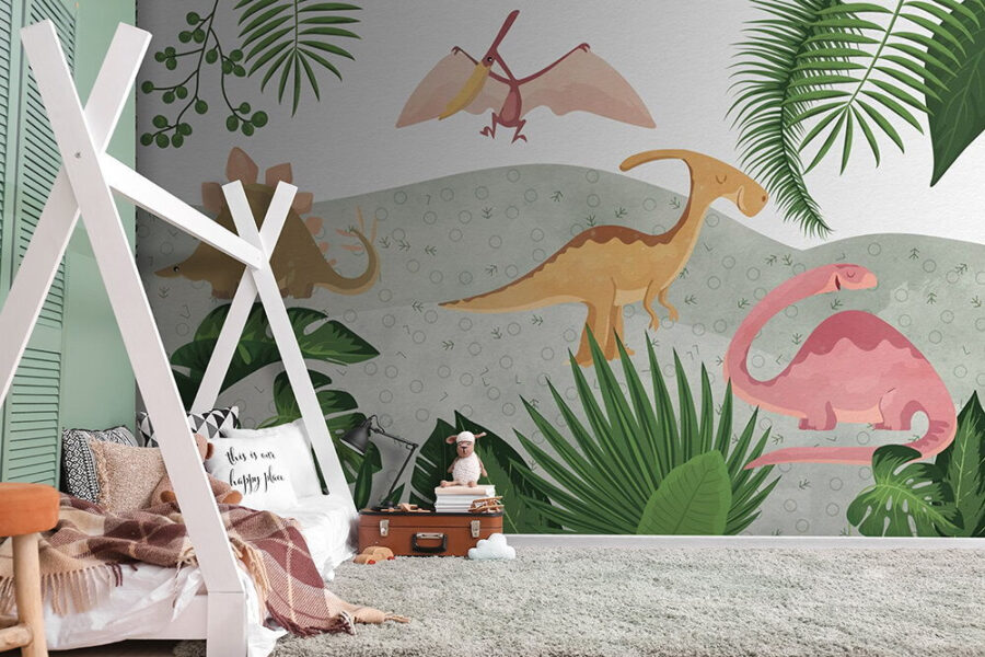 Trasforma la stanza dei tuoi bambini in un paradiso dei dinosauri con questo affascinante “Murale con gruppo di dinosauri e foglie”. Immagina quei piccoli esploratori che guardano con stupore gli erbivori giocosi e un pterosauro volante sfacciato: la loro immaginazione si scatenerà! È più di un semplice murale: è una storia che aspetta solo di essere scoperta da una mente curiosa. Ogni dinosauro sembra quasi vivo, pronto a balzare in azione. I rilassanti toni verdi e i delicati colori pastello aggiungono un’atmosfera tranquilla, come un piccolo angolo di paradiso preistorico. Questo murale non è solo un elemento decorativo, ma un invito all’avventura e un tocco di allegria in qualsiasi stanza. Perfetto per stimolare la creatività, ammettiamolo: chi non vorrebbe svegliarsi circondato da simpatici dinosauri?