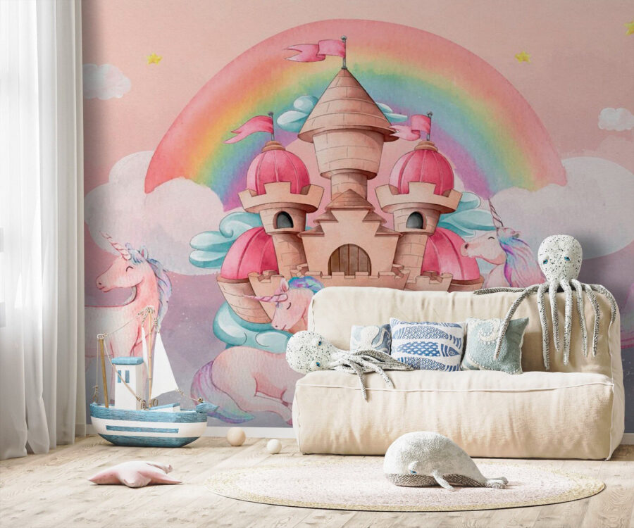 I deliziosi dettagli, come il cestino di cibo che un unicorno porta con disinvoltura, aggiungono un tocco giocoso che stimola l’immaginazione. Si potrebbe immaginare un tea party da sogno proprio vicino al castello, sotto un cielo pieno di stelle scintillanti e nuvole soffici. I delicati colori pastello riscaldano il cuore, rendendo il murale un centrotavola accogliente. Non si tratta solo di una decorazione murale, ma di una porta d’accesso a sogni e avventure ad occhi aperti.