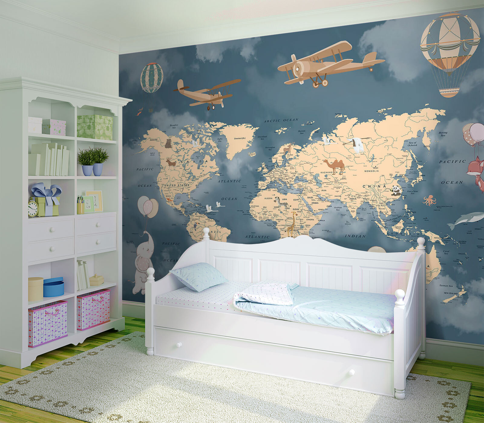Avete mai sognato di solcare i cieli in mongolfiera, ma nel comfort di casa vostra? Beh, questo murales vi soddisfa. “Hot Air Balloon in the Sky” trasforma una parete semplice in una stravagante mappa del mondo, con tanto di palloncini fluttuanti e graziosi animali appesi. È come una mini-avventura per i bambini e, onestamente, fa venire voglia di unirsi a loro, vero? Perfetto per stimolare la curiosità e dare a qualsiasi stanza un’atmosfera giocosa e sognante. Immaginate le storie della buonanotte o i momenti di gioco con questo sfondo: infinite possibilità! Fa sembrare le lezioni di geografia un viaggio intorno al mondo. Gli esploratori di tutte le età lo adoreranno.