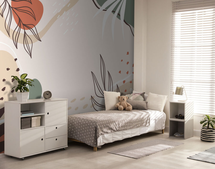 Avete presente il senso di calma e creatività che si prova durante una passeggiata nella natura? Immaginate di imbottigliarlo e di spruzzarlo sulle vostre pareti. È quello che fa questo murale “Foglie e forme astratte”. È come una boccata d’aria fresca, ma al chiuso. Le linee fluide e le forme organiche sono così rilassanti per gli occhi, perfette per trasformare qualsiasi parete semplice in una piccola oasi.