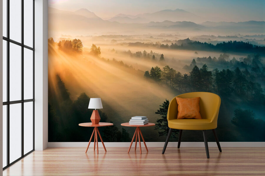 Trasformate qualsiasi spazio con questo splendido murale che cattura un paesaggio nebbioso, dove gli alberi si fondono perfettamente con le montagne in lontananza. Immaginate di svegliarvi ogni giorno con questa vista serena, sorseggiando un caffè mentre la nebbia mattutina si diffonde: sembra quasi un accogliente abbraccio della natura. I colori tenui e la luce delicata creano un’atmosfera rilassante che invita al relax. Perfetto per un soggiorno o una camera da letto, aggiunge un livello di profondità e tranquillità. Immaginate gli amici che condividono le loro storie nel suo caldo abbraccio, sentendosi come immersi nel cuore di una tranquilla foresta. Una beatitudine istantanea!
