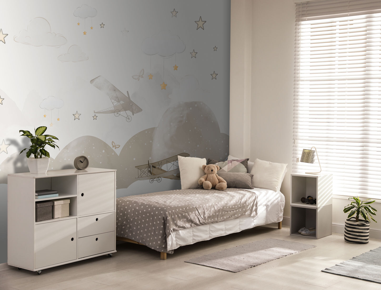 Immaginate di entrare in una stanza dove le pareti sembrano sussurrare storie di avventura e sogni sereni. È esattamente ciò che offre questo murale, dal nome stravagante di “White Star on a White Background”. Una scena da sogno con aeroplani d’epoca che fluttuano tra soffici nuvole e dolci stelle: è come entrare in un sogno ad occhi aperti o nelle favole sognanti che si leggevano da bambini. Perfetto per la camera dei bambini o, in generale, per qualsiasi spazio che desideri un po’ di magia! È come una coperta accogliente, confortante e invitante. Immaginate gli occhi dei vostri bambini che si illuminano quando lo vedono ogni giorno. Va oltre l’arredamento: è un po’ di magia sulla parete.