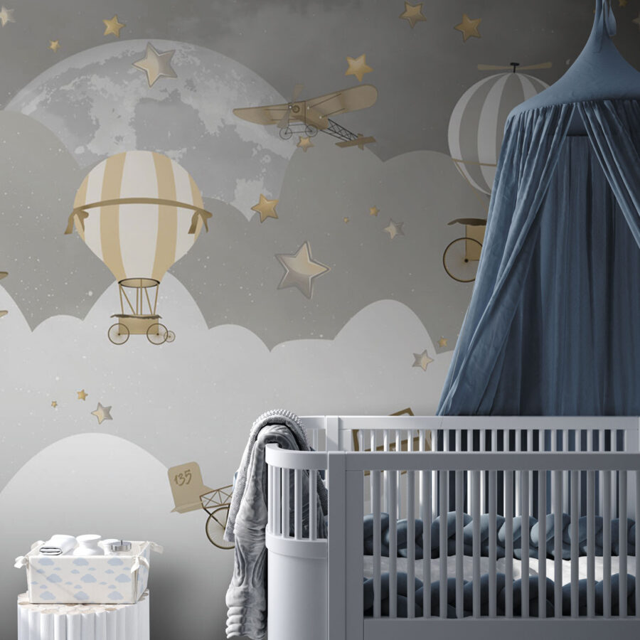 Immaginate di librarvi in volo su nuvole e stelle da sogno con questo incantevole murale. “Vintage Aircrafts Soaring Through Stars” vi trasporta in uno stravagante cielo notturno dove aerei e mongolfiere d’altri tempi si librano tra stelle scintillanti. Perfetto per aggiungere un tocco nostalgico a qualsiasi spazio, è un successo per bambini e adulti. I vostri piccoli si sentiranno come se stessero vivendo delle avventure notturne e sarà anche un ottimo oggetto di conversazione per la stanza degli ospiti. I colori tenui rendono questo pezzo versatile: è rilassante, ma sempre ricco di fascino e carattere. Sognante e delizioso, è come una dolce storia della buonanotte in forma di murale.
