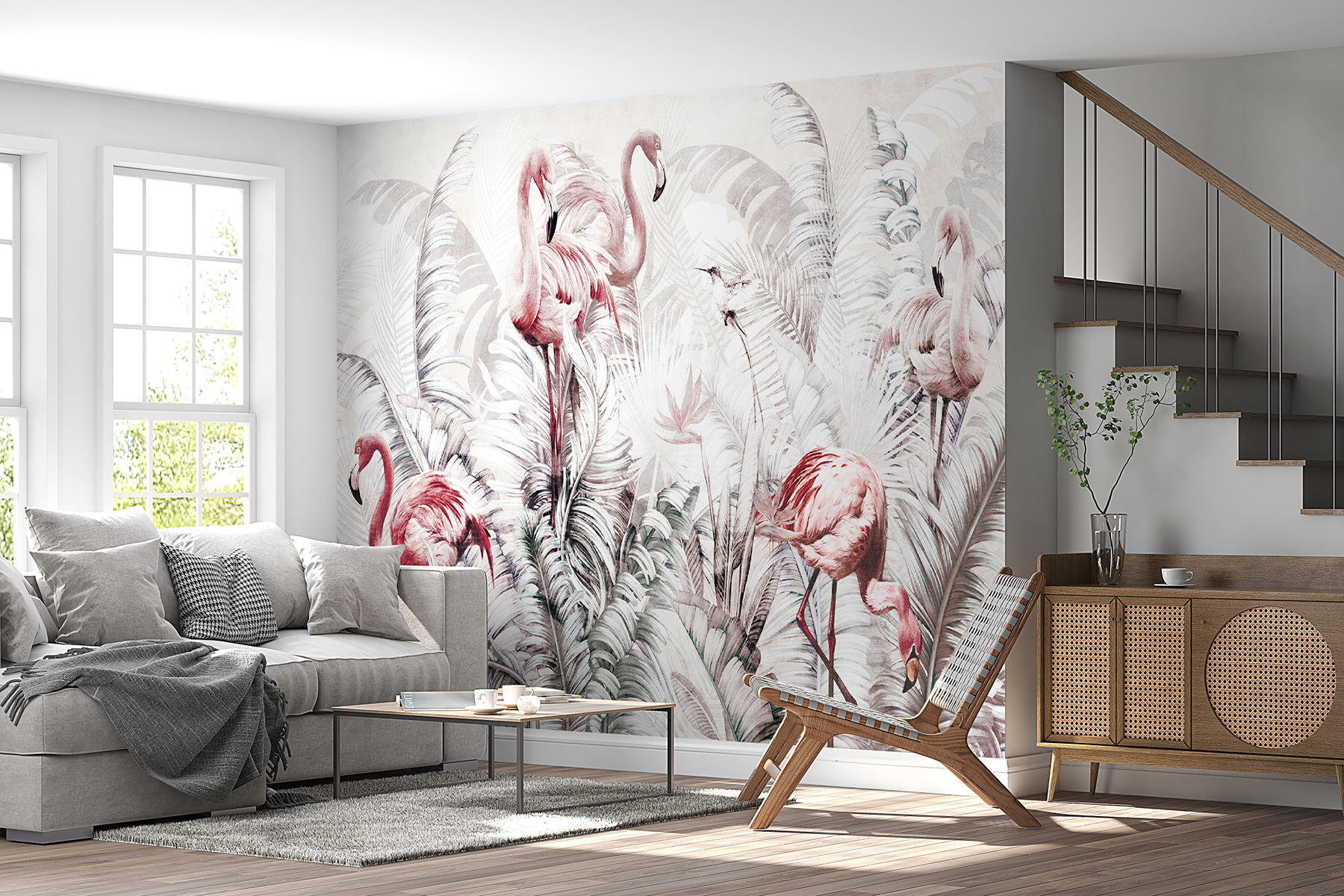 Sia che si tratti di un soggiorno, di una camera da letto o di un ufficio creativo, questo murale aggiunge un tocco giocoso ma sofisticato. Le morbide tonalità pastello si mescolano senza sforzo con l’audace rosa fenicottero, facendo sembrare l’intera scena un pacifico sogno ad occhi aperti.