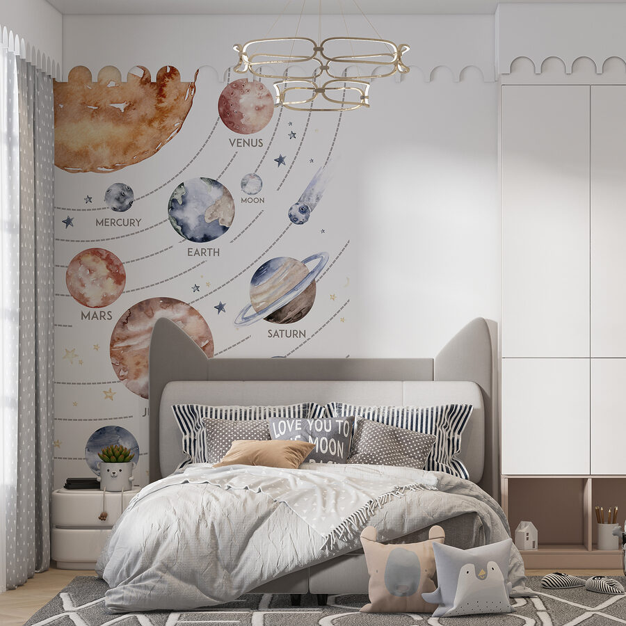 Immaginate i momenti di sonno sotto il dolce bagliore degli anelli di Saturno o i vivaci momenti di gioco con Mercurio e Giove che fanno la guardia. L’atmosfera artistica e rassicurante che si respira è quella giusta: niente poster didattici rigidi e noiosi. Solo un bellissimo pezzo unico che porta un tocco di magia galattica direttamente a casa vostra. Che si tratti di abbellire una cameretta o di aggiungere fascino a una stanza dei giochi, questo murale è un’ottima scelta. 🌟