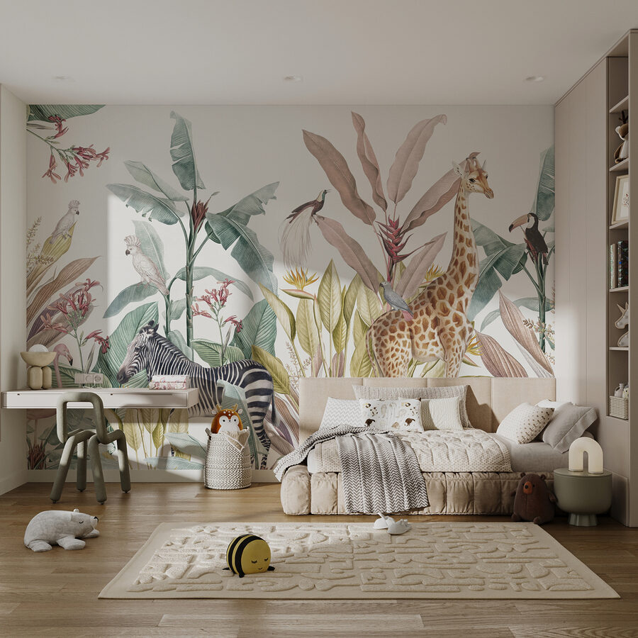 Avete bisogno di un rapido viaggio nella savana? Il murale “Giraffa con uccello sulla schiena” fa al caso vostro. Questo murale per bambini è pieno di colori e di simpatici animali del safari, perfetti per stimolare l’immaginazione dei vostri figli. C’è un’eccentrica giraffa in piedi con un piccolo uccello appollaiato sulla schiena – un delizioso amico a sorpresa! Una zebra sgranocchia con disinvoltura le foglie e un pappagallo fa capolino, aggiungendo un tocco di colore e un umorismo sfacciato. È come un libro di fiabe giocose direttamente sulla parete e trasforma ogni stanza in una mini-avventura. Prendetene uno e lasciate che l’immaginazione del vostro bambino si scateni!