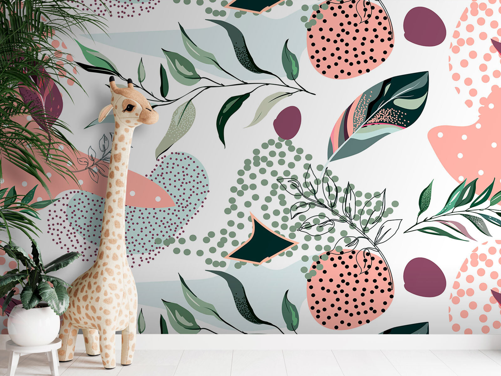 Avete mai visto un murale e vi sembra che porti una ventata di aria fresca in una stanza? Questo è esattamente ciò che fa il motivo Abstract Leaves and Dots. È una danza giocosa di foglie e punti stravaganti, perfetta per infondere un po’ di allegria nella stanza dei bambini. Immaginate vostra figlia che si sveglia con questa allegra serie di forme pastello, che le rallegra immediatamente la mattinata. O forse vostro figlio potrà sognare ad occhi aperti avventure tra il fogliame astratto.