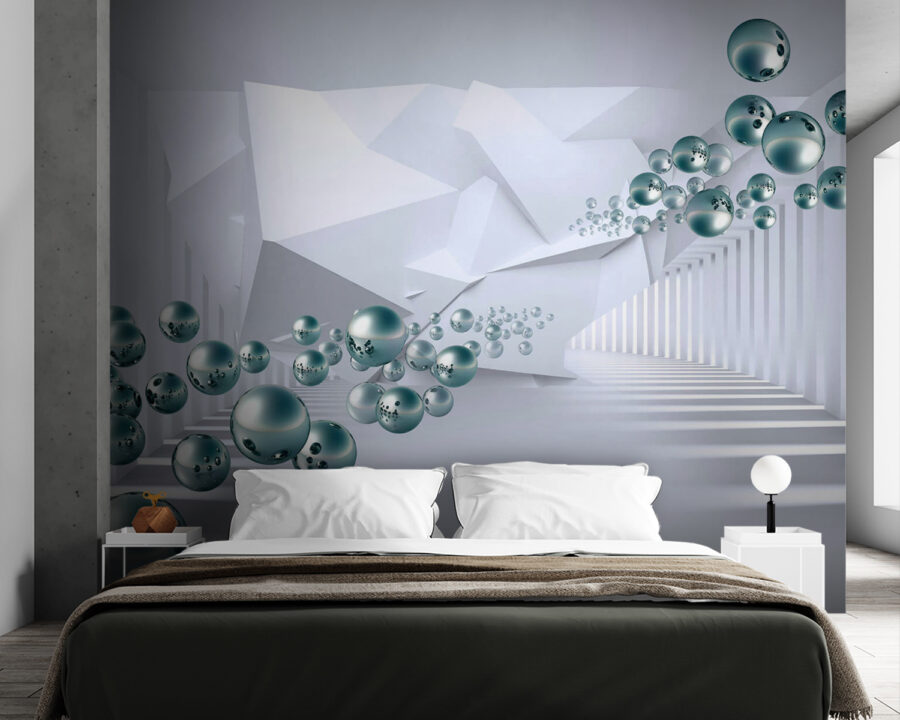 Trasformate qualsiasi spazio in un’evasione da sogno con questo murale con sfere fluttuanti in un corridoio elegante e astratto. Immaginatevi di entrare in una stanza che sembra uscita da un film di fantascienza. Le sfere sembrano danzare, invitando alla curiosità e alla meraviglia. È un perfetto spunto di conversazione: gli ospiti potrebbero chiedere se sono entrati in un’altra dimensione. I riflessi della luce creano un senso di profondità, facendo sentire le pareti vive, quasi come se respirassero. Ideale per un salotto accogliente o un ufficio stravagante, questo murale aggiunge quel pizzico di creatività che tutti segretamente desiderano. Lasciate che l’immaginazione prenda il sopravvento!