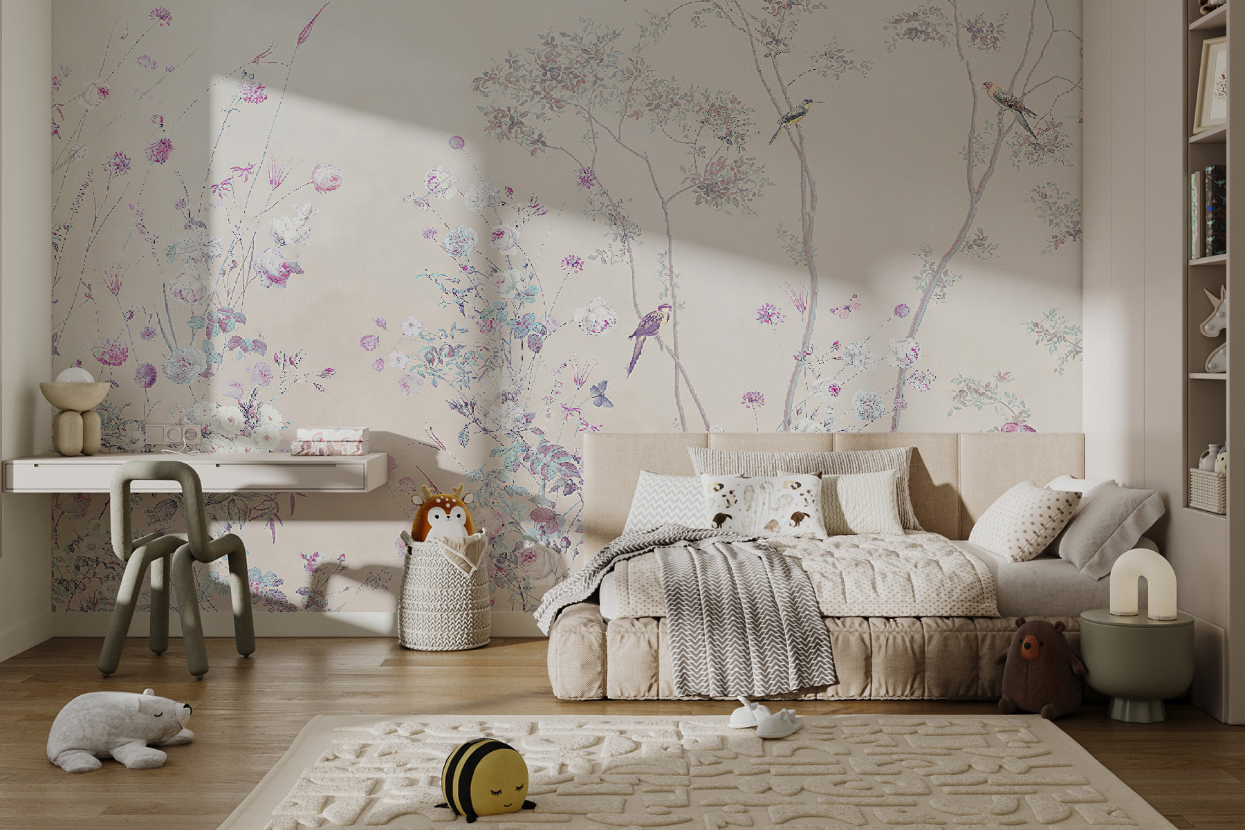 Questo murale, “Fiori pastello e uccelli in armonia”, è come una melodia morbida e sognante per le vostre pareti. Immaginate di riempire il vostro spazio con fiori e uccelli delicati, tutti in tranquille tonalità pastello. È perfetto per tutti coloro che amano la bellezza della natura e vogliono portare un tocco di aria aperta all’interno senza avere a che fare con lo sporco o gli insetti. Potrebbe essere l’ideale per trasformare una stanza noiosa in un piccolo santuario. I colori delicati e la scena rilassante potrebbero farvi sentire come in un giardino incantato. Perfetto per una camera da letto o per un accogliente angolo lettura dove sognare il pomeriggio. E poi, chi non vorrebbe svegliarsi ogni mattina con un campo di fiori e la dolce compagnia di piccoli uccelli?