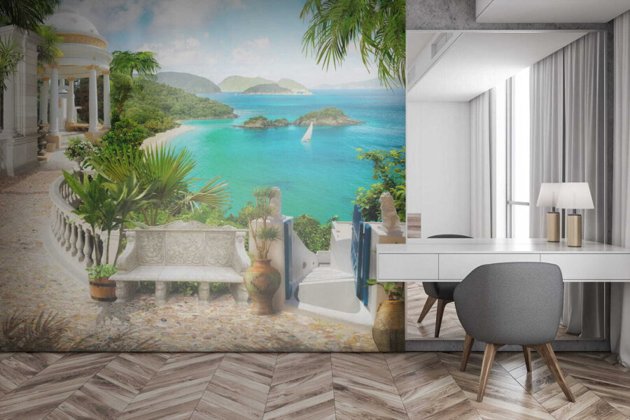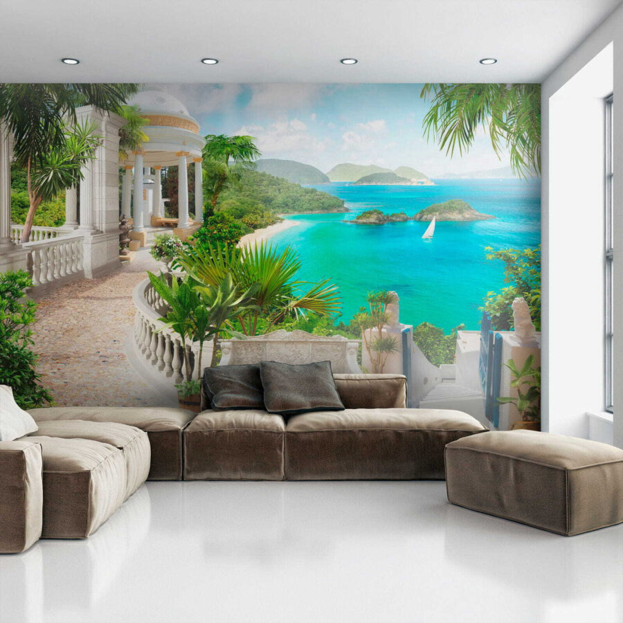 Immaginate di entrare nella vostra stanza e di essere immediatamente trasportati in un sereno paradiso marino. Questo è esattamente ciò che fa il “Carta da parati Plant in a Pot”. È come avere un luogo di mini-vacanza proprio sulla vostra parete. Le piante verdi e rigogliose, il tranquillo padiglione bianco e l’acqua turchese mozzafiato: la serenità è perfetta!