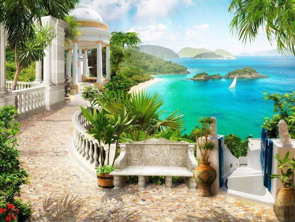 Immaginate di entrare nella vostra stanza e di essere immediatamente trasportati in un sereno paradiso marino. Questo è esattamente ciò che fa il “Carta da parati Plant in a Pot”. È come avere un luogo di mini-vacanza proprio sulla vostra parete. Le piante verdi e rigogliose, il tranquillo padiglione bianco e l’acqua turchese mozzafiato: la serenità è perfetta!