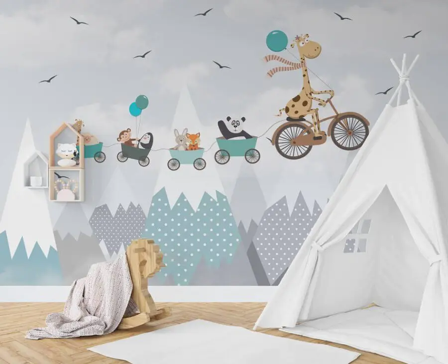 Volete aggiungere un po’ di fantasia alla stanza dei vostri figli? Date un’occhiata al “Murales Giraffa in bicicletta”: è come un delizioso sogno ad occhi aperti schizzato sul muro. Questo divertente murale mostra un’avventurosa giraffa che pedala attraverso un paesaggio da sogno, trainando una parata di adorabili animali. I tenui colori pastello e le scene giocose trasporteranno il vostro piccolo in un mondo di immaginazione, rendendolo perfetto per le camerette o le stanze dei giochi. Immaginate che le storie della buonanotte si trasformino in viaggi incredibili con questo sfondo. E poi, gli incantevoli pois e le montagne? Troppo carini. Questo murale non è solo una decorazione, ma un biglietto per l’avventura ogni giorno.