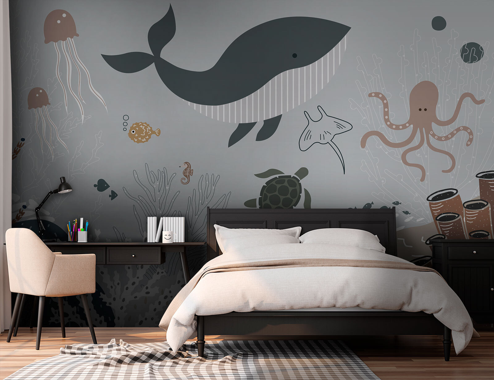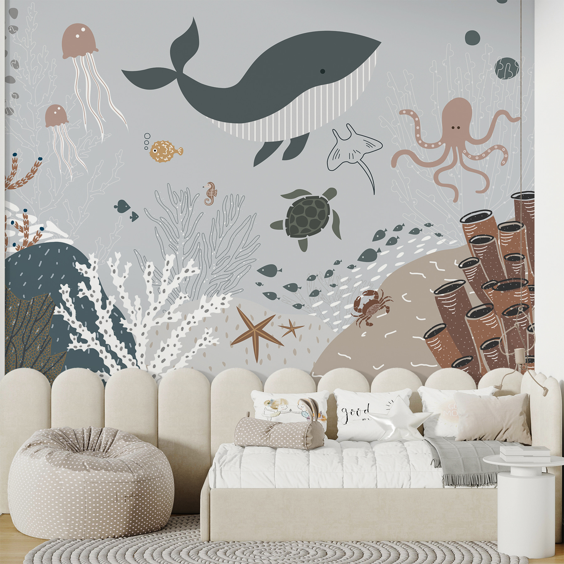 Immaginate di trasformare la stanza del vostro piccolo in un incantevole mondo sottomarino con questo giocoso murale “Cartoon of a Whale”. Perfetto per la stanza di ogni bambino, il murale raffigura simpatiche creature marine come balene, tartarughe e meduse in morbide tonalità acquerellate. È come portare una fetta di oceano in casa vostra senza bagnarvi!