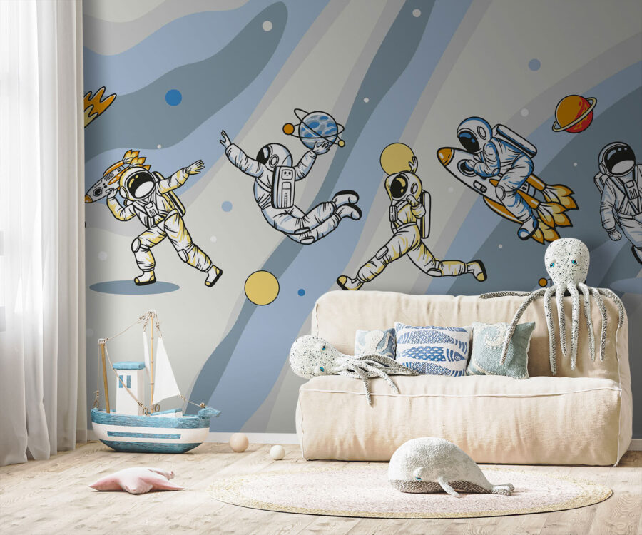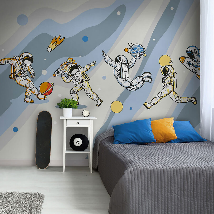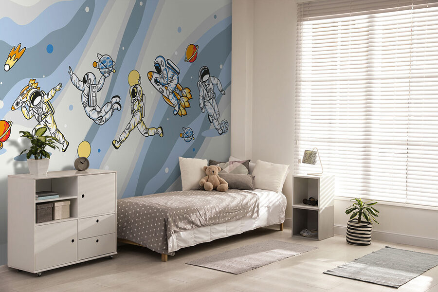 Date un’occhiata a questo fantastico murale: “Cartone animato di un astronauta con un razzo in testa”. È come un fumetto che prende vita, perfetto per aggiungere divertimento e avventura a qualsiasi stanza. Immaginate di averlo nella cameretta di un bambino o in una sala giochi… I piccoli dettagli, come gli astronauti che danzano intorno ai pianeti, fanno sorridere. Inoltre, accende l’immaginazione: chi non vorrebbe sognare viaggi nello spazio e navi a razzo? È divertente, stravagante e un po’ fuori dagli schemi, proprio come dovrebbe essere ogni buona avventura. È un modo super divertente per rendere uno spazio creativo e vivace!