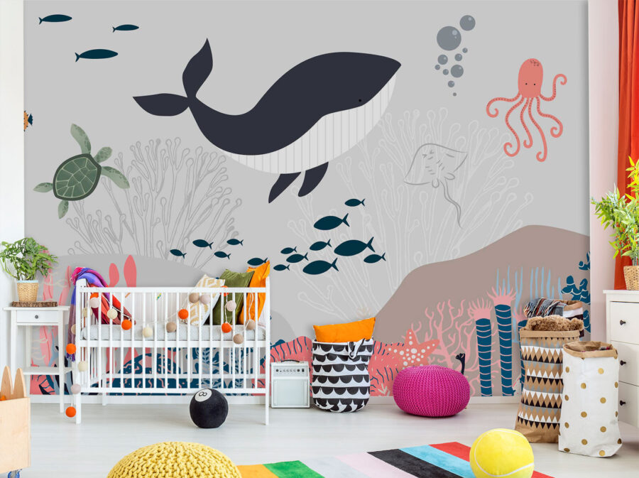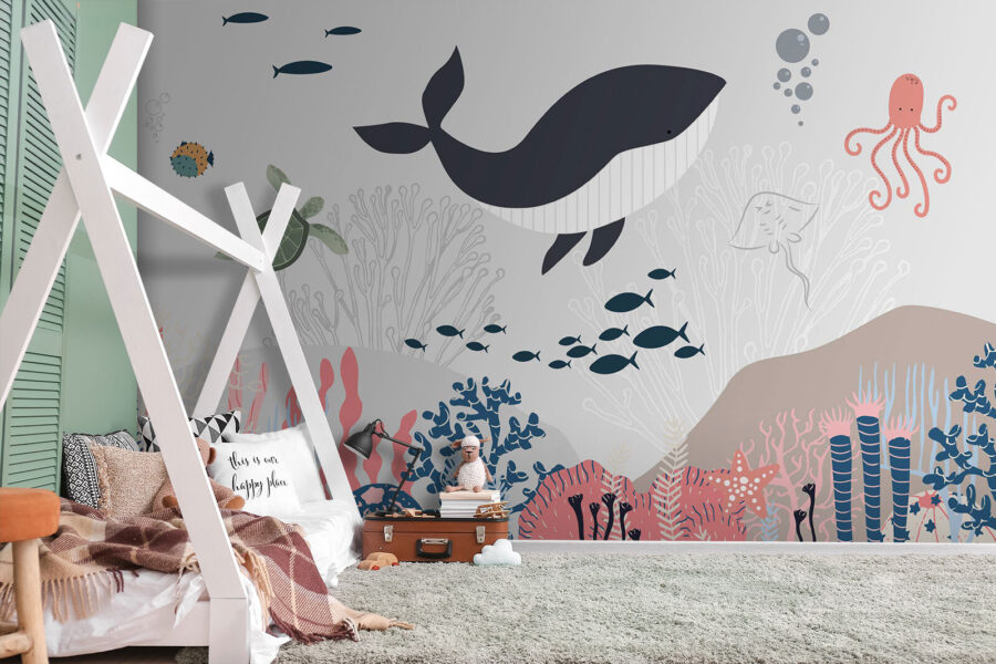 Volete aggiungere un tocco di divertimento alla stanza dei vostri figli? Date un’occhiata al murale “Balena e tartaruga sott’acqua”. Questo murale non è solo per le pareti: è un’avventura sotto il mare, proprio a casa vostra. Immaginate un’allegra balena e una curiosa tartaruga che nuotano insieme in un colorato mondo sottomarino. È perfetto per stimolare la fantasia dei bambini e creare storie della buonanotte sulle avventure dell’oceano. In più, non è troppo movimentata o luminosa, ma solo una tavolozza morbida che tranquillizza e diverte. Immaginate gli occhi del vostro bambino che si illuminano quando vede il polipo o il banco di pesci! È come avere un acquario senza la manutenzione. Un tocco delizioso e stravagante per qualsiasi cameretta o stanza dei giochi. Tuffatevi in questo murale e lasciate che la magia sottomarina abbia inizio!
