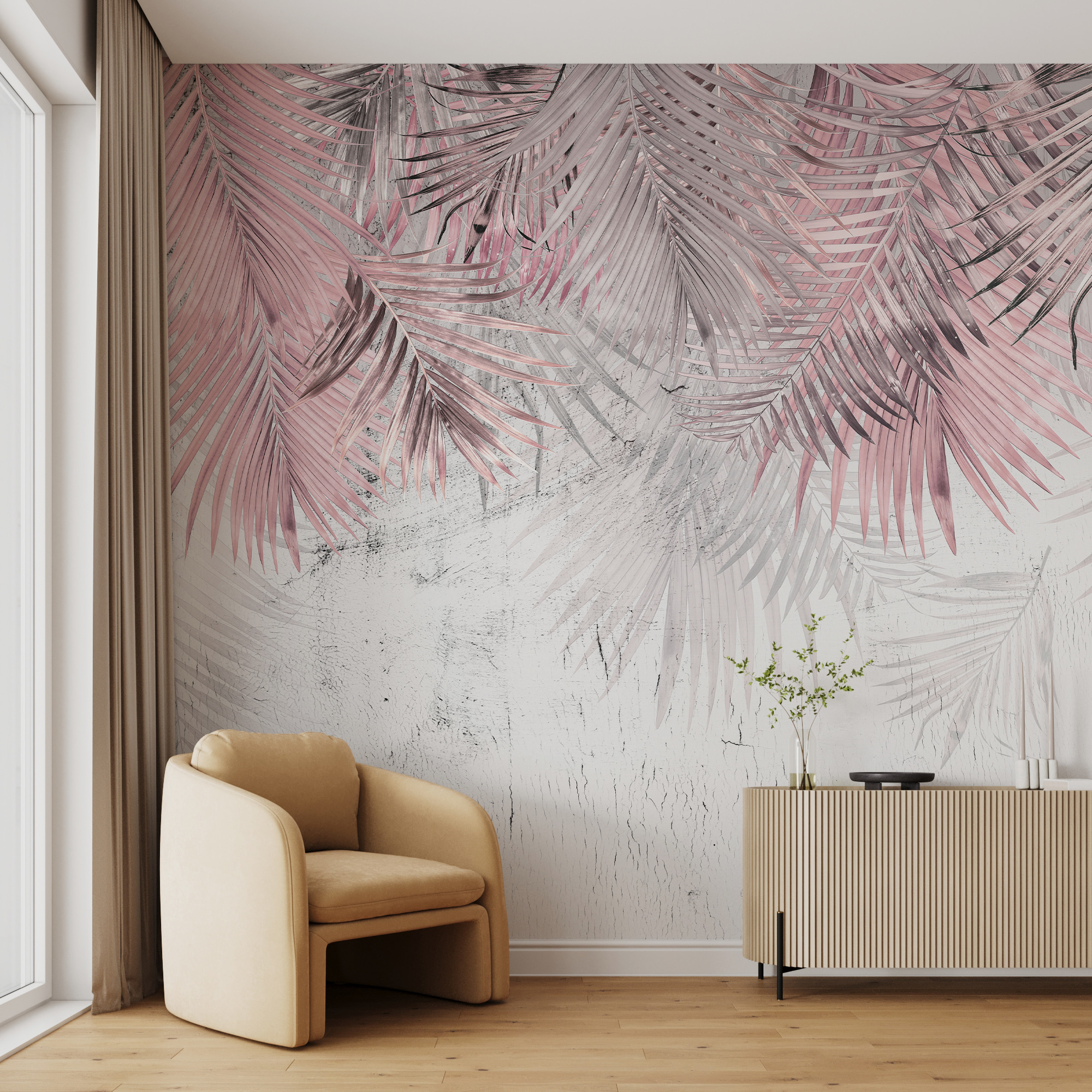 Immaginate un salotto accogliente o una camera da letto serena, dove i murales non sovrastano lo spazio ma aggiungono un tocco magico. “Foglie di palma pastello su sfondo bianco” fa proprio questo. È come entrare in un paradiso tropicale da sogno ogni volta che si entra nella stanza. Le delicate tonalità pastello e le foglie ariose rendono le pareti vive e tranquille, perfette per sfuggire allo stress quotidiano.