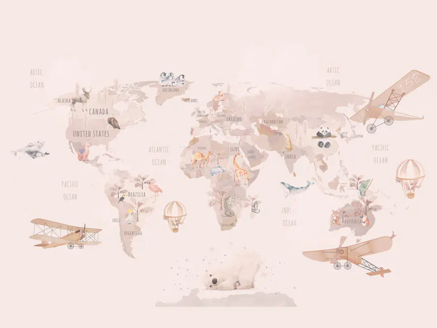 Trasformate qualsiasi stanza in un viaggio stravagante intorno al mondo con questo delizioso murale, “Map of the World”. È come una lettera d’amore all’avventura, con incantevoli illustrazioni di animali e aerei giocosi, che stimolano immediatamente la curiosità e la voglia di viaggiare. Immaginate i più piccoli mentre indicano i loro Paesi preferiti o sognano terre esotiche circondati da questi affascinanti disegni. Grazie ai colori tenui e agli elementi ludici, trasforma le pareti in una tela dell’immaginazione, perfetta per le camerette o le stanze dei giochi. Questo murale non si limita a decorare, ma invita a raccontare storie e a sognare. Quindi, via all’esplorazione!