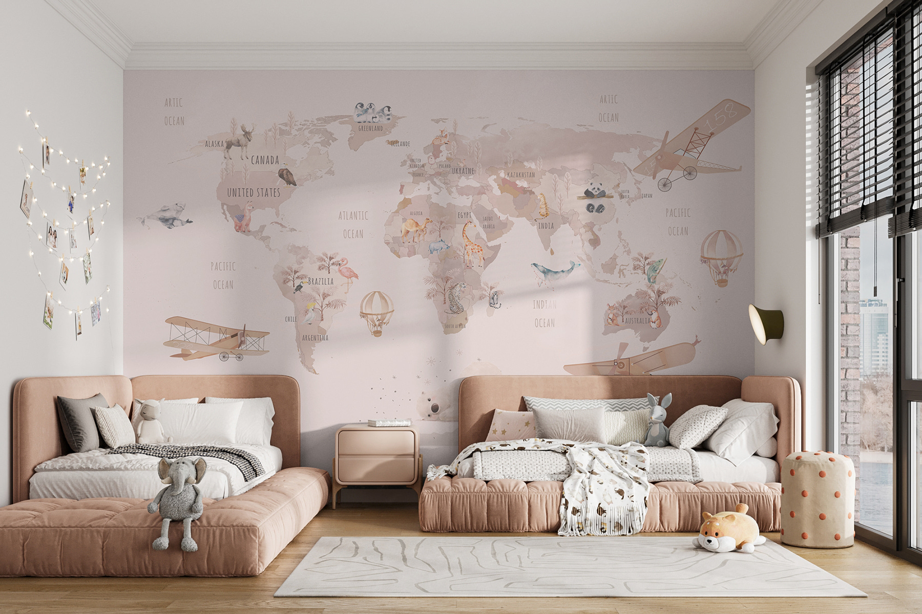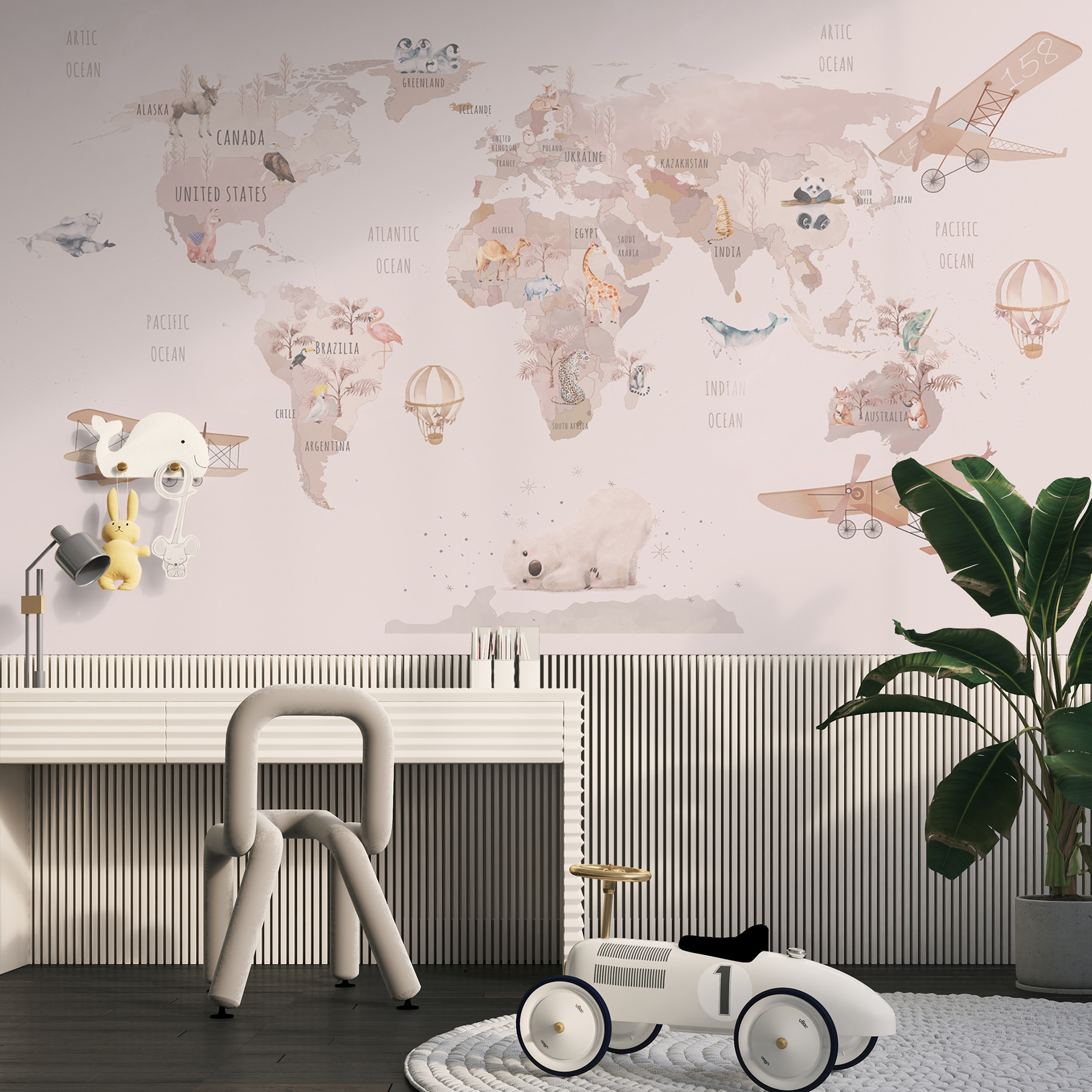 Trasformate qualsiasi stanza in un viaggio stravagante intorno al mondo con questo delizioso murale, “Map of the World”. È come una lettera d’amore all’avventura, con incantevoli illustrazioni di animali e aerei giocosi, che stimolano immediatamente la curiosità e la voglia di viaggiare. Immaginate i più piccoli mentre indicano i loro Paesi preferiti o sognano terre esotiche circondati da questi affascinanti disegni. Grazie ai colori tenui e agli elementi ludici, trasforma le pareti in una tela dell’immaginazione, perfetta per le camerette o le stanze dei giochi. Questo murale non si limita a decorare, ma invita a raccontare storie e a sognare. Quindi, via all’esplorazione!