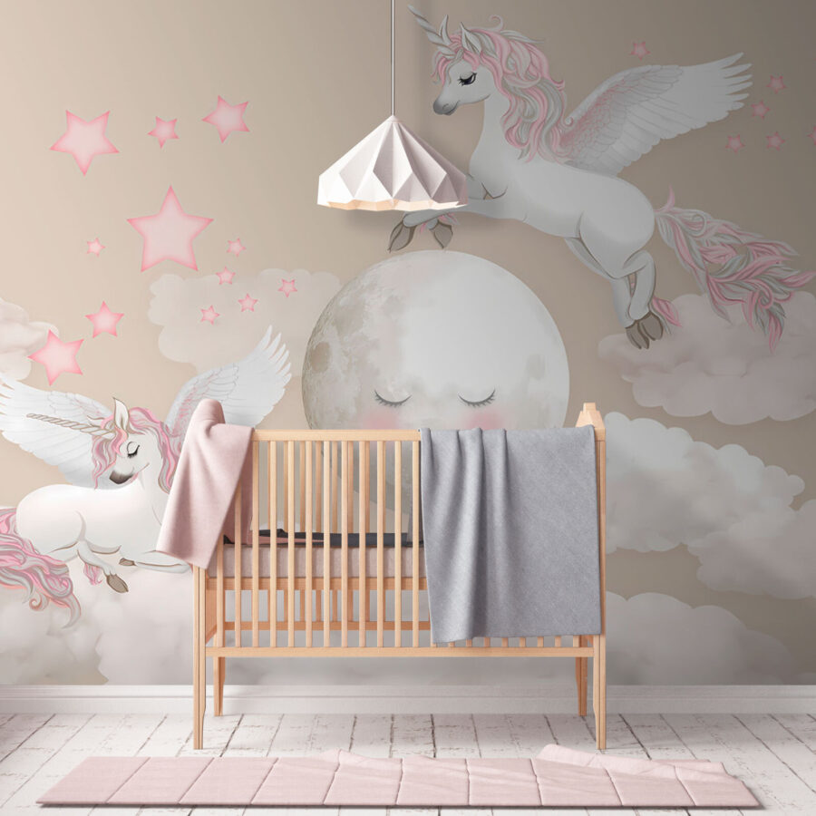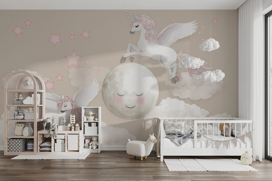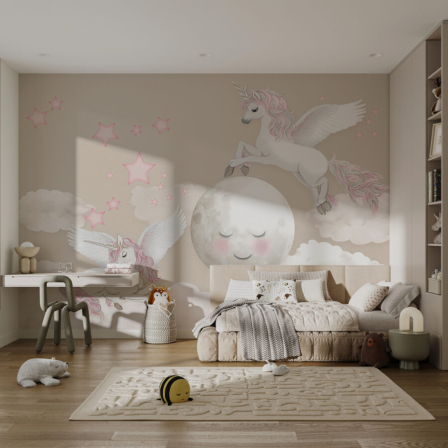 Immaginate: la cameretta del vostro bambino trasformata in una stravagante terra dei sogni con questo adorabile murale “Unicorno con ali e corno”. È pieno di nuvole soffici, stelle scintillanti e gli unicorni più carini e magici che volano. L’atmosfera è morbida, sognante e perfetta per stimolare l’immaginazione dei più piccoli. Immaginate le storie della buonanotte sotto lo sguardo gentile di questi unicorni incantati: ogni notte sarà come un viaggio in un lontano regno delle fiabe. È come avere un pezzo di magia appeso alla parete, che crea momenti di gioia e meraviglia, ancora e ancora.