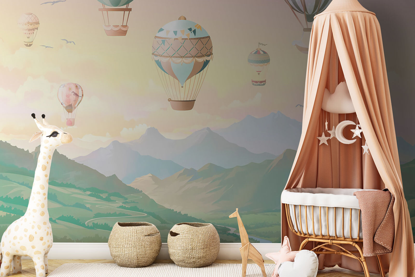 Trasformate lo spazio di un bambino in uno stravagante paese delle meraviglie con questo murale di mongolfiere! Immaginatevi una dolce alba che proietta sfumature morbide in tutta la stanza, mentre palloncini colorati fluttuano serenamente in un paesaggio da sogno. È come invitare un po’ di avventura a casa vostra senza dover fare le valigie. I bambini possono immaginare di librarsi in volo tra soffici nuvole o di organizzare feste in cielo con bandiere giocose che danzano nella brezza. Il bello è che un murales come questo non solo stimola la creatività, ma regala anche un fascino sereno, perfetto per l’ora del pisolino o per le sessioni di racconti. Osservate i visi dei bambini che si illuminano sognando viaggi stravaganti: è più di un semplice decoro, è un invito all’esplorazione!
