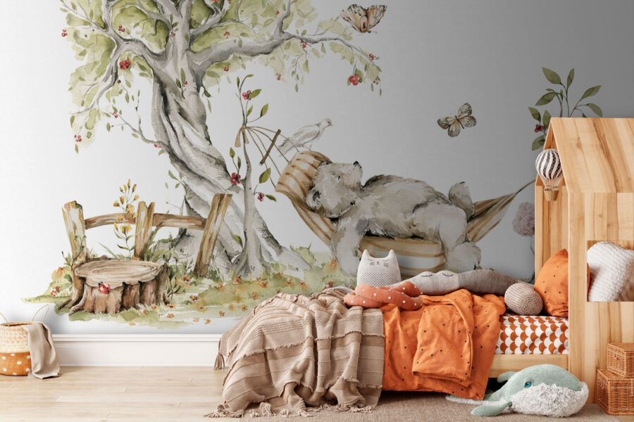Non è un’idea carinissima? Immaginate questo murale, “Bear Daydreaming in Peaceful Hammock” (Orso che sogna ad occhi aperti in un’amaca pacifica), nella stanza del vostro piccolo: una fuga da sogno! Immaginate un accogliente orso che si sdraia su un’amaca sotto un albero stravagante, con le farfalle che svolazzano. È come una scena di una fiaba, perfetta per creare quelle vibrazioni magiche nelle camerette o nelle aree gioco.