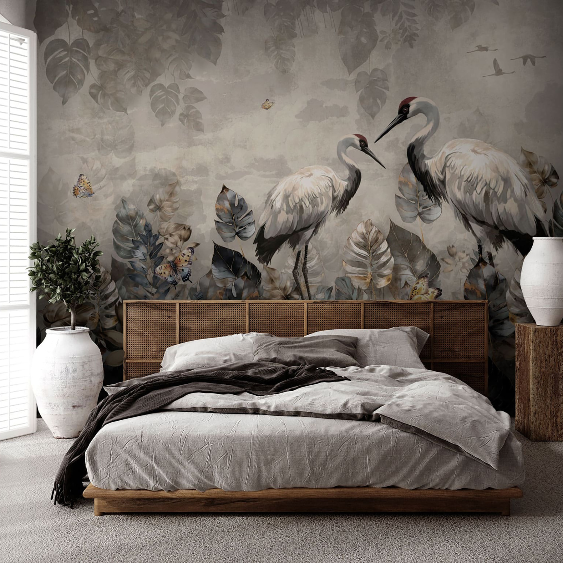 Immaginate di svegliarvi, stiracchiarvi e immergervi nella vista serena di due gru, una delle quali tiene in mano un pesce, proprio sulla vostra parete. Questo murale è più di una semplice decorazione: è come avere una fetta di poesia della natura in casa. Danza tra i blu lunatici e i grigi terrosi, con quelle farfalle che svolazzano intorno a foglie che sembrano essere state baciate dal tardo autunno.