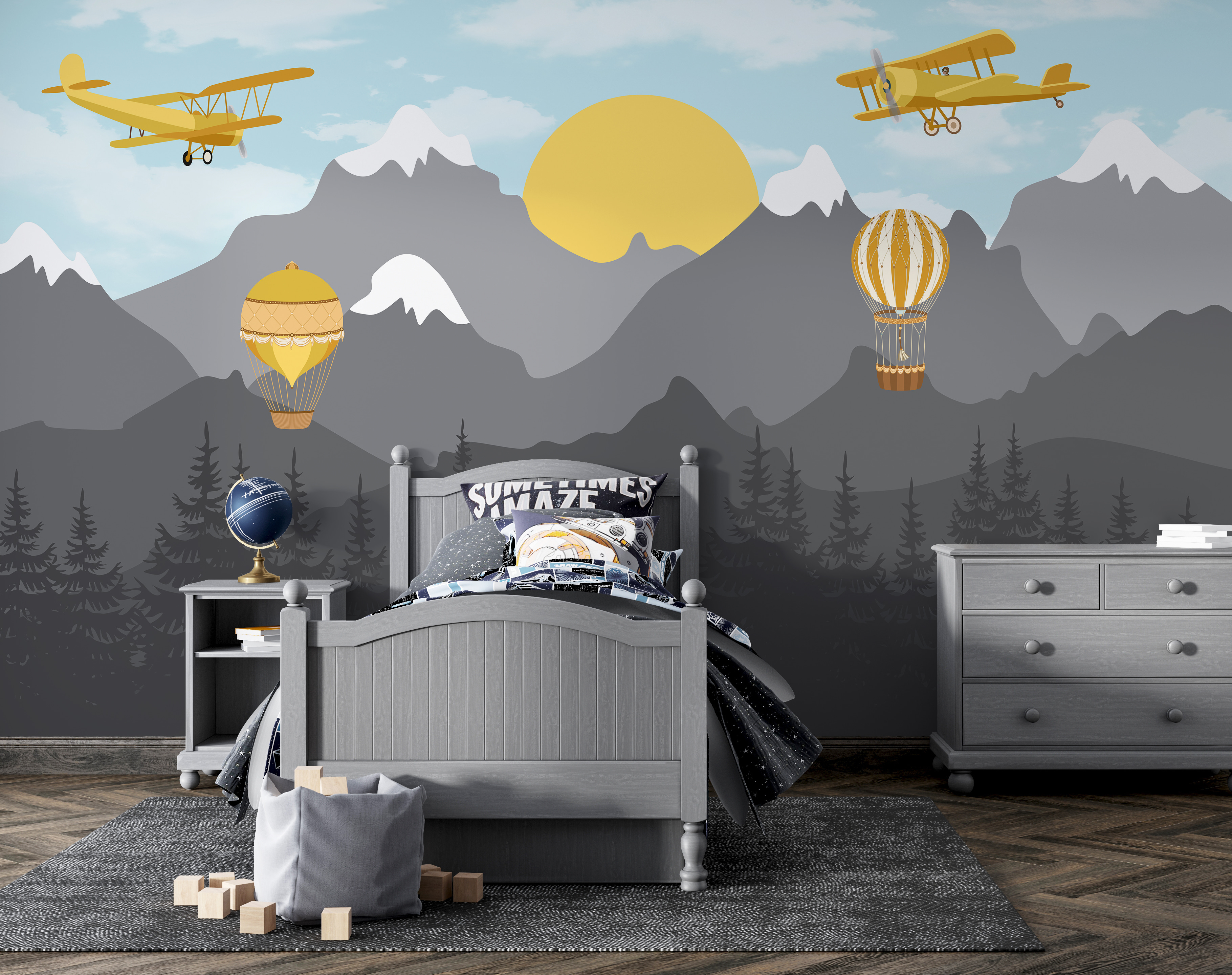 Trasformate la cameretta di un bambino in una stravagante avventura nel cielo con questo delizioso murale che raffigura un aeroplano giallo che si libra sopra maestose montagne e giocose mongolfiere. Immaginate l’emozione dei piccoli che guardano in alto, sognando terre lontane e il brivido del volo. I blu tenui e i grigi tenui creano uno sfondo rilassante, mentre il giallo allegro cattura l’attenzione e accende la gioia. Appendetelo in una cameretta o in un’area giochi e guardate l’immaginazione spiccare il volo! È come avere un pezzetto di cielo in casa, anche se non con nuvole vere. Perfetto per gli spiriti avventurosi!