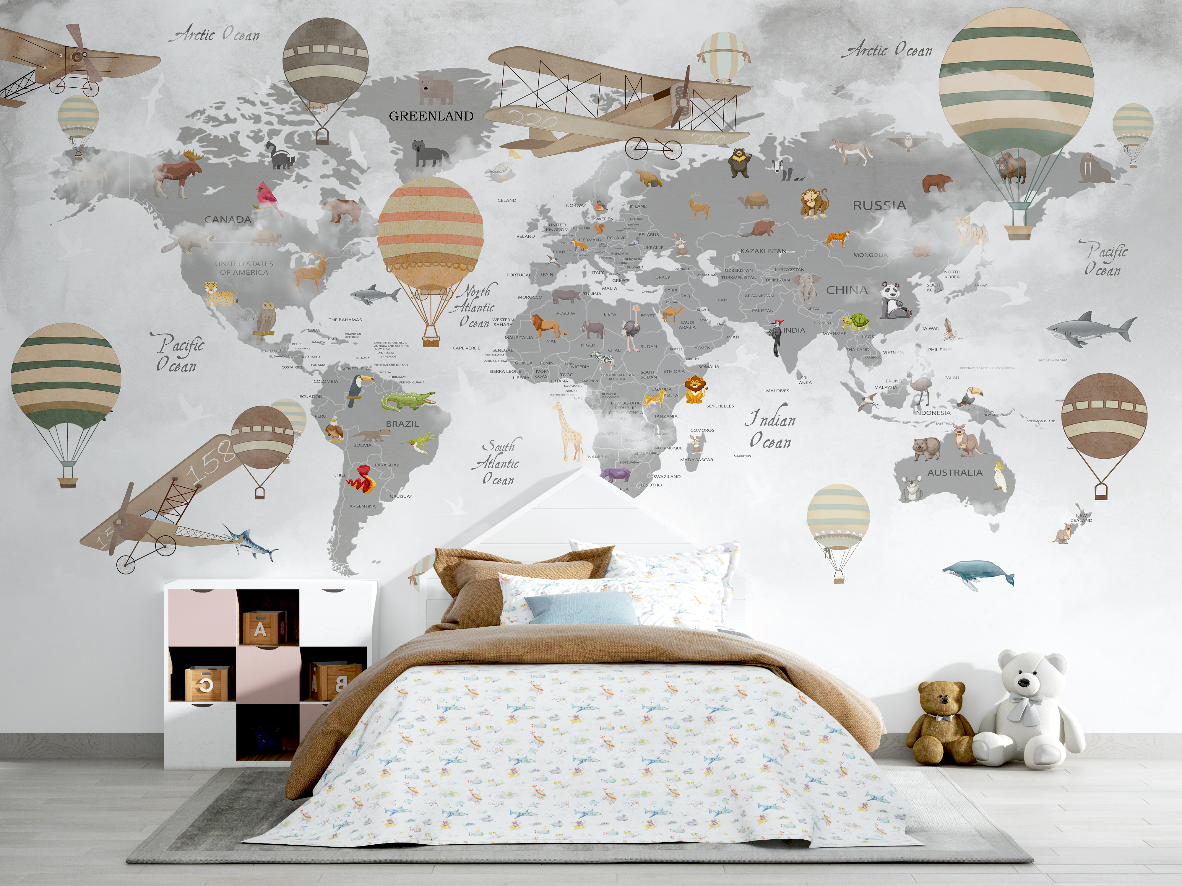 Immaginatevi il vostro piccolo avventuriero che si sveglia in una stanza piena di mongolfiere stravaganti che fluttuano su una mappa d’altri tempi! “Mongolfiera con squalo sullo sfondo” è un murale stravagante e incantevole, perfetto per stimolare la curiosità. Non si tratta solo di geografia, ma di una storia in attesa di essere raccontata. Immaginatevi le favole della buonanotte che raccontano di viaggi in tutto il mondo, di incontri con animali e di sbirciatine a quello squalo impertinente. Ideale per i bambini che sognano in grande, trasforma qualsiasi spazio in una piattaforma di lancio per l’immaginazione. È divertente, educativo e con un tocco di fascino vintage, il tutto racchiuso in una favolosa decorazione da parete!