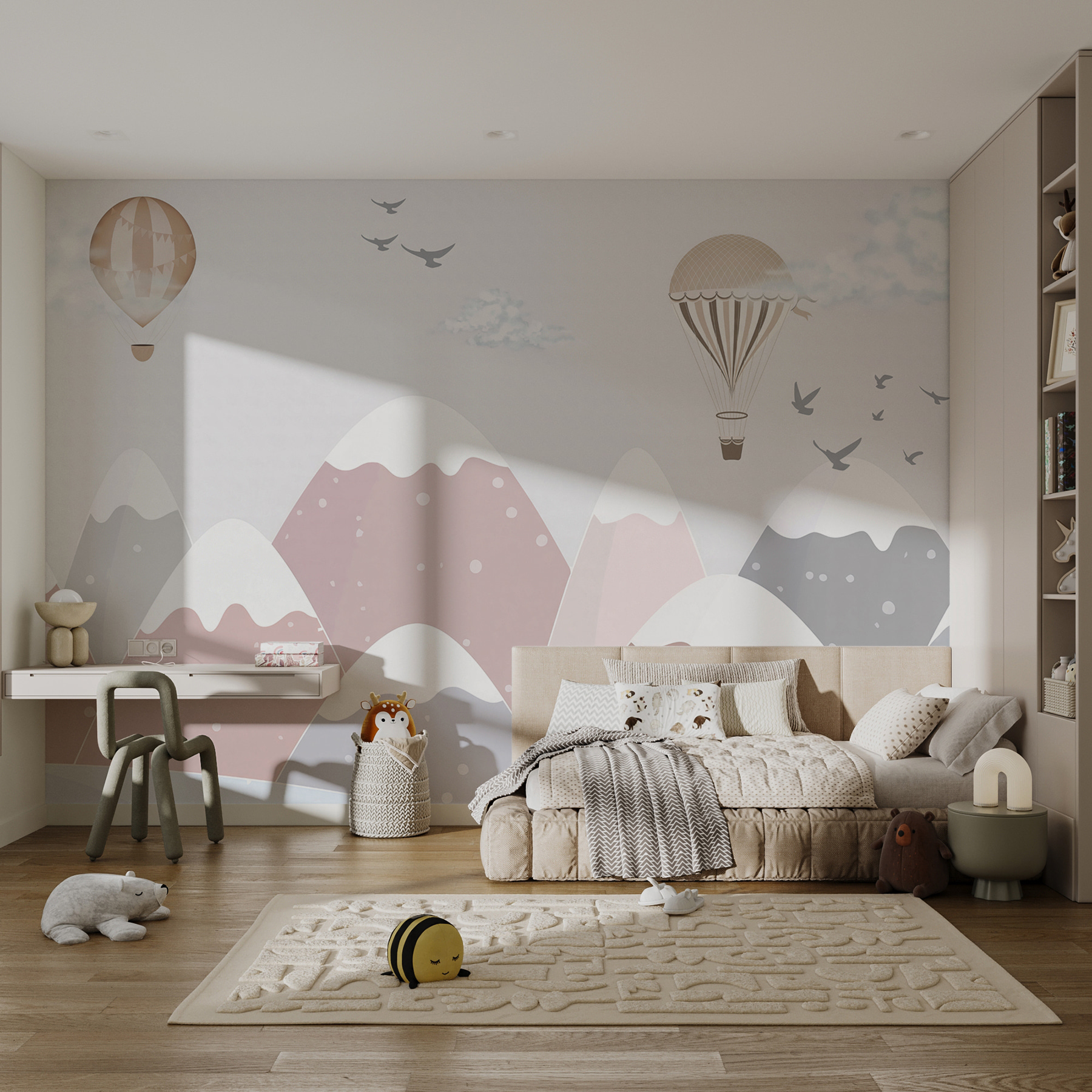 Immaginate una stanza accogliente dove i palloncini svettano sulle montagne innevate. Questo delizioso murale, “Balloons Soar Above Snowy Mountains”, è perfetto per uno spazio dedicato ai bambini. È realizzato con colori tenui e rilassanti che sembrano usciti da un sogno. Immaginatelo nella camera di vostra figlia o anche nella cameretta: palloncini che fluttuano dolcemente nel cielo, stimolando l’immaginazione e la meraviglia.
