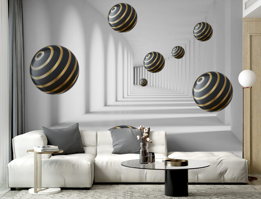 Immaginate di entrare in una stanza e di avere la sensazione di entrare in un’altra dimensione. Questo è esattamente ciò che fa “Carta da parati Striped Spheres Hover in White Corridor”. È un design moderno, quasi ipnotico, che dà la sensazione di trovarsi in un tunnel futuristico. Le sfere, con le loro eleganti strisce, sembrano fluttuare senza sforzo, creando un senso di profondità che può far sembrare lo spazio più grande. È un po’ come avere il proprio set cinematografico di fantascienza direttamente sulla parete!