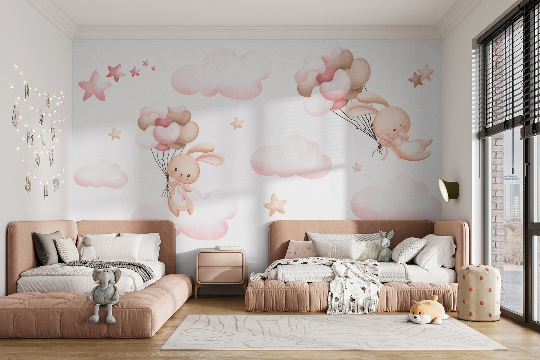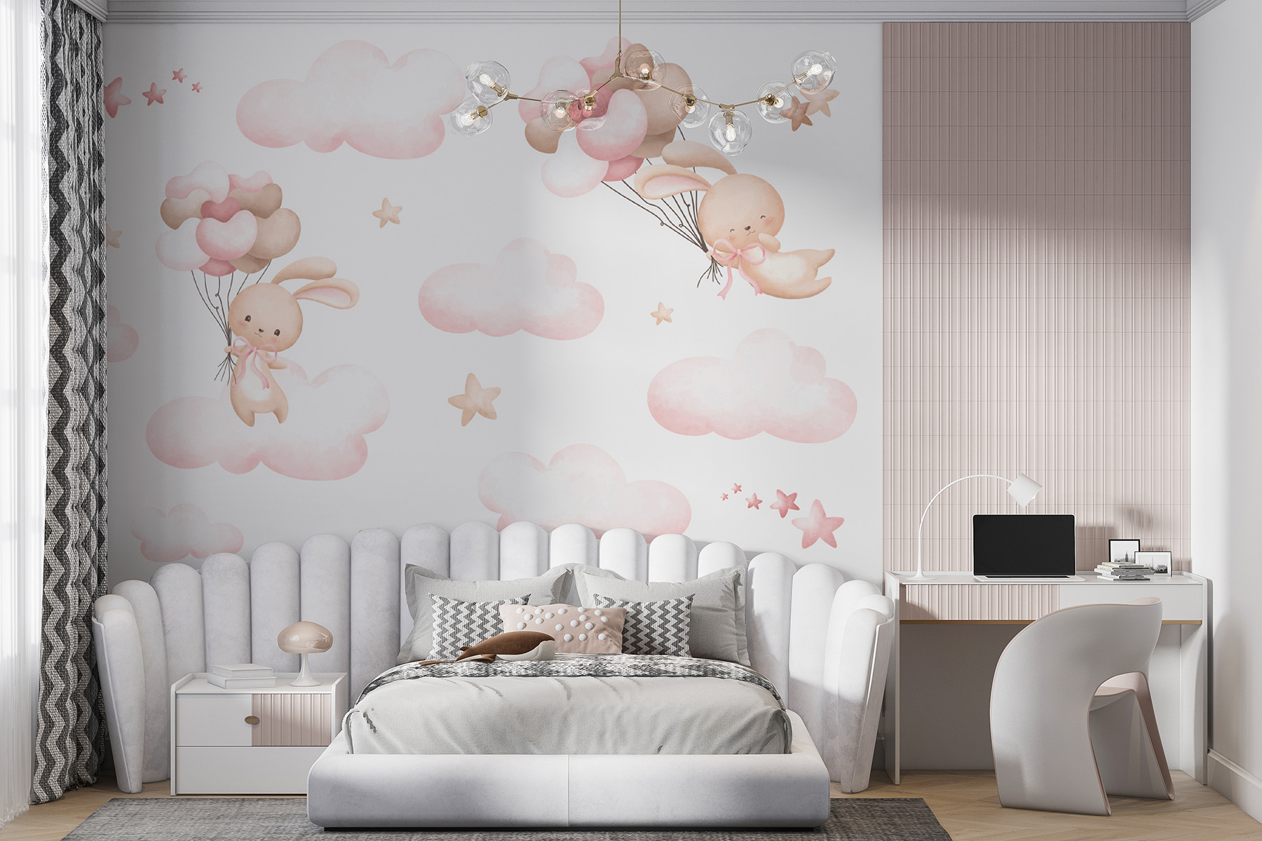 Rendi più luminoso lo spazio di ogni bambino con questo delizioso murale che raffigura un affascinante coniglietto che fluttua tra soffici nuvole e stelle scintillanti. Immaginate la gioia del viso di un bambino che guarda questa scena stravagante, lasciando che la sua immaginazione si abbandoni ad avventure da sogno. I colori tenui creano un’atmosfera rilassante, perfetta per rilassarsi dopo una lunga giornata di gioco. È come un dolce abbraccio per la loro stanza, che invita a raccontare storie e a fare sogni d’oro. Trasformate le pareti vuote in un cielo magico e guardate come ogni angolo si riempie di calore e meraviglia. Immaginatelo: abbracciati sotto le coperte, con gli occhi spalancati dall’eccitazione e sognando le avventure dei coniglietti. Uno scenario perfetto per le risate dei più piccoli!