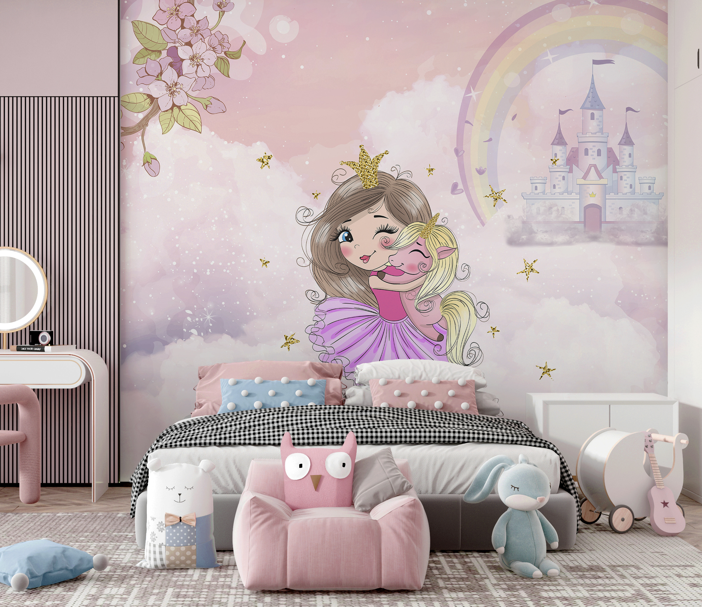 Questo murale è pura magia per la stanza di ogni bambino! Immaginatevi una scena uscita da una fiaba: una dolce bambina che abbraccia il più soffice degli unicorni. I colori pastello, le stelle scintillanti e il castello da sogno sotto l’arcobaleno: è come entrare in un libro di fiabe. Perfetto per scatenare sorrisi e sogni ad occhi aperti. Inoltre, conferisce alla stanza un’atmosfera morbida e delicata che è semplicemente incantevole. Immaginate che il vostro piccolo si svegli ogni giorno in questo stravagante paese delle meraviglie: renderà sicuramente le mattine un po’ più magiche.