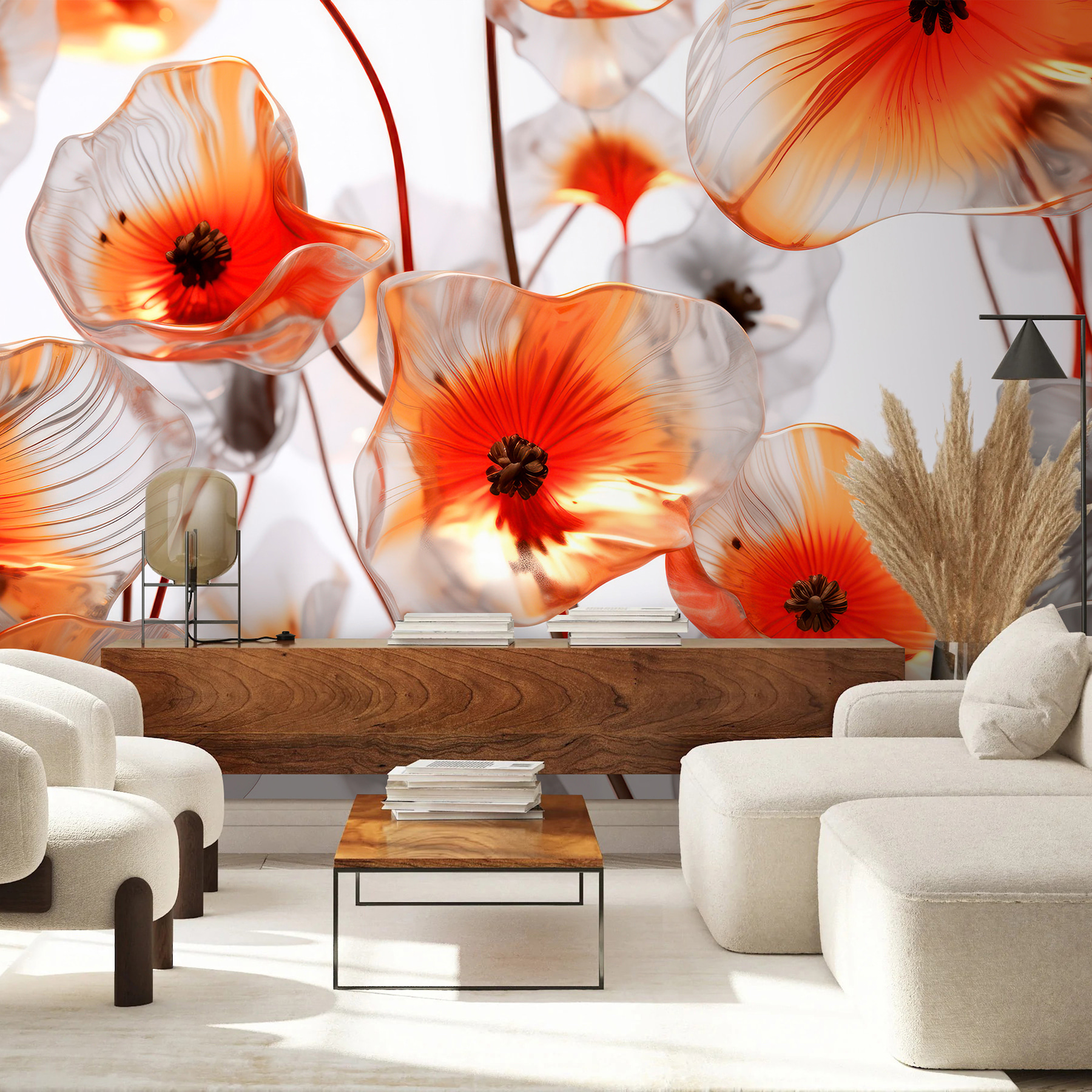 Immaginatevi la vostra parete praticamente sbocciata con questi bellissimi fiori traslucidi, ognuno dei quali mostra i centri arancioni vibranti che spiccano. Non si tratta di un semplice murales, ma di uno sprazzo di vita proprio sulla vostra parete. Immaginate di entrare nel vostro salotto e di sentirvi immediatamente sollevati da questi fiori luminosi e più grandi della vita. È quasi come se potessero ondeggiare con la brezza che soffia attraverso la finestra aperta.