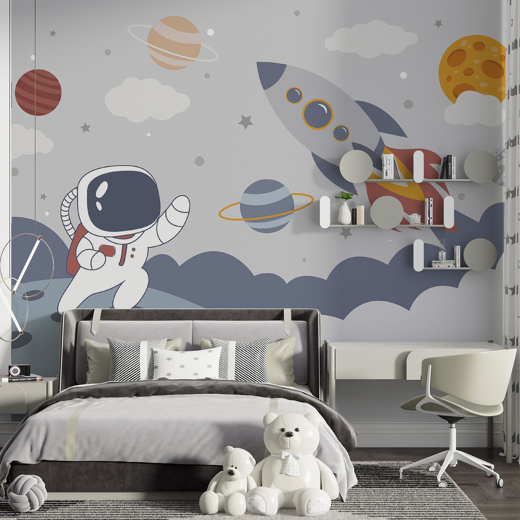 Trasformare lo spazio di un bambino in un’avventura cosmica è facile come questo murale con un affascinante astronauta e vivaci pianeti. Immaginate un bambino che guarda questa scena fuori dal mondo, sognando viaggi nello spazio e fughe intergalattiche. Il design giocoso porta una dose di immaginazione, perfetta per stimolare la curiosità sull’universo. Gli anelli colorati e le nuvole stravaganti invitano a sognare ad occhi aperti e a raccontare storie, rendendo il momento della nanna un po’ meno ordinario. Non è solo una decorazione, è una porta d’accesso a una galassia di meraviglia e gioia!