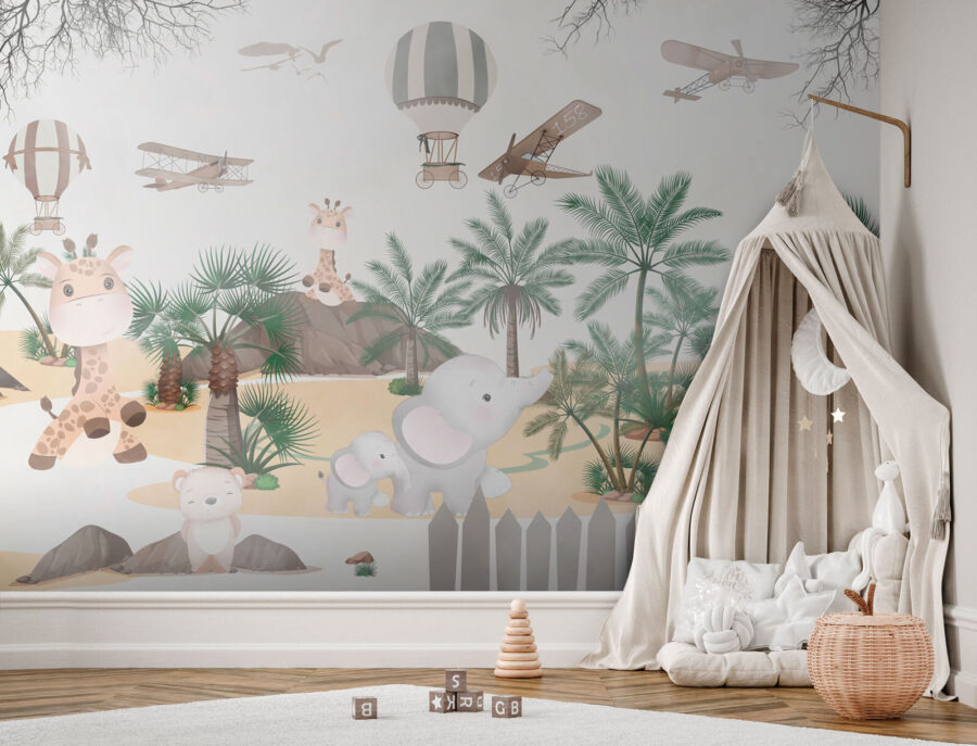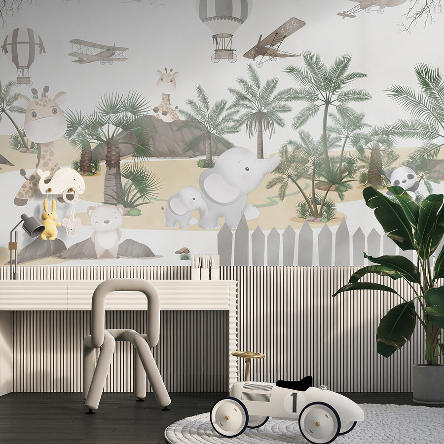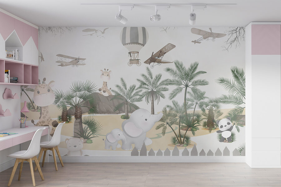 Si può quasi sentire il fruscio delle foglie di palma e vedere i volti dei bambini illuminarsi di eccitazione e curiosità. Date vita all’immaginazione con questo delizioso murale, perfetto per stimolare la gioia e l’ispirazione in ogni spazio per bambini.