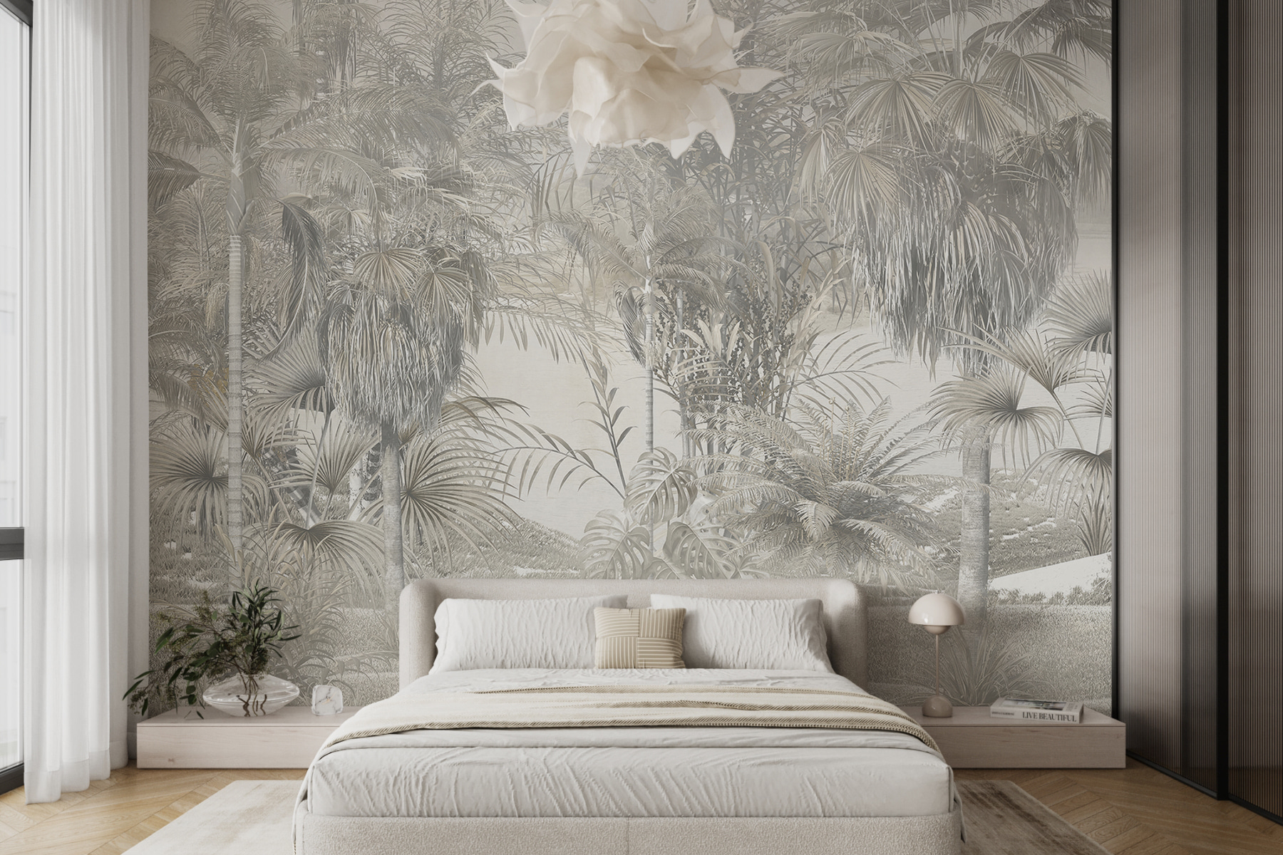 Avete mai sognato di entrare in un’oasi tropicale da sogno? Il murales “Alberi tropicali in un paesaggio nebbioso” potrebbe fare al caso vostro. Immaginate di svegliarvi con una vegetazione lussureggiante, foglie graziosamente ombreggiate, il tutto avvolto in un morbido velo nebbioso. È come un viaggio sereno nella giungla senza lasciare il vostro spazio accogliente.