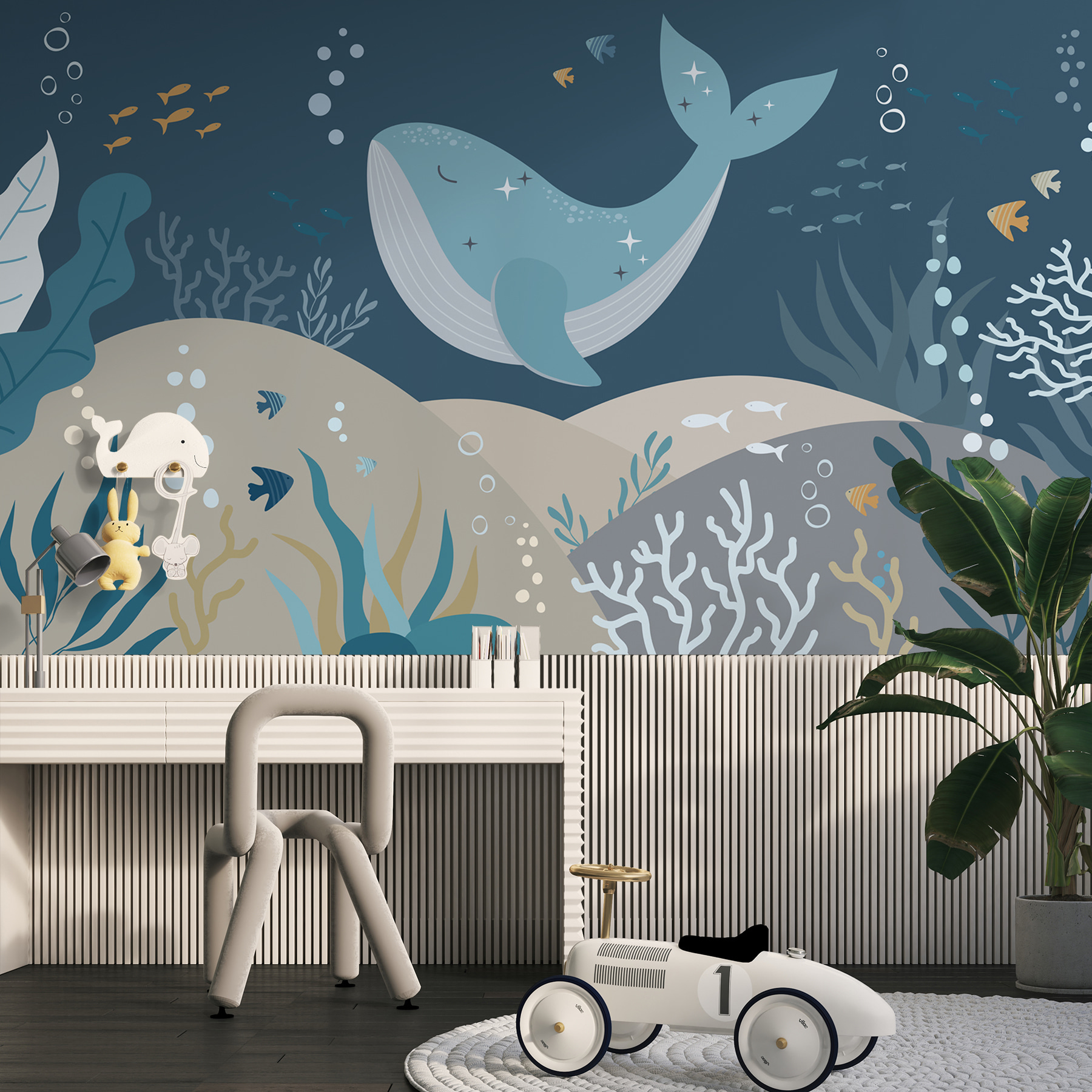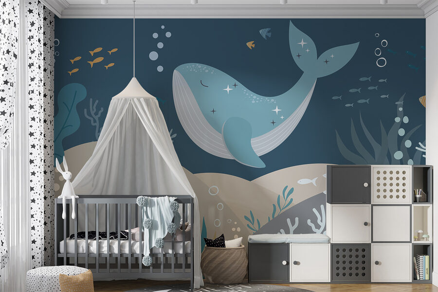 Guardate questo stravagante murale, “Balena blu con stelle e pesci”. Davvero, è come immergersi in un mondo da sogno sottomarino! Perfetto per la cameretta dei bambini, immaginate una balena blu alla deriva, cosparsa di stelle scintillanti e circondata da pesci giocosi. Non stupitevi se i più piccoli si perderanno nelle loro avventure oceaniche. I morbidi toni del blu sono come un abbraccio calmo, così rilassante. Trasformate il momento della nanna in un magico viaggio in mare ogni notte con questo incantevole murale. È come portare un pezzo di oceano a casa vostra!