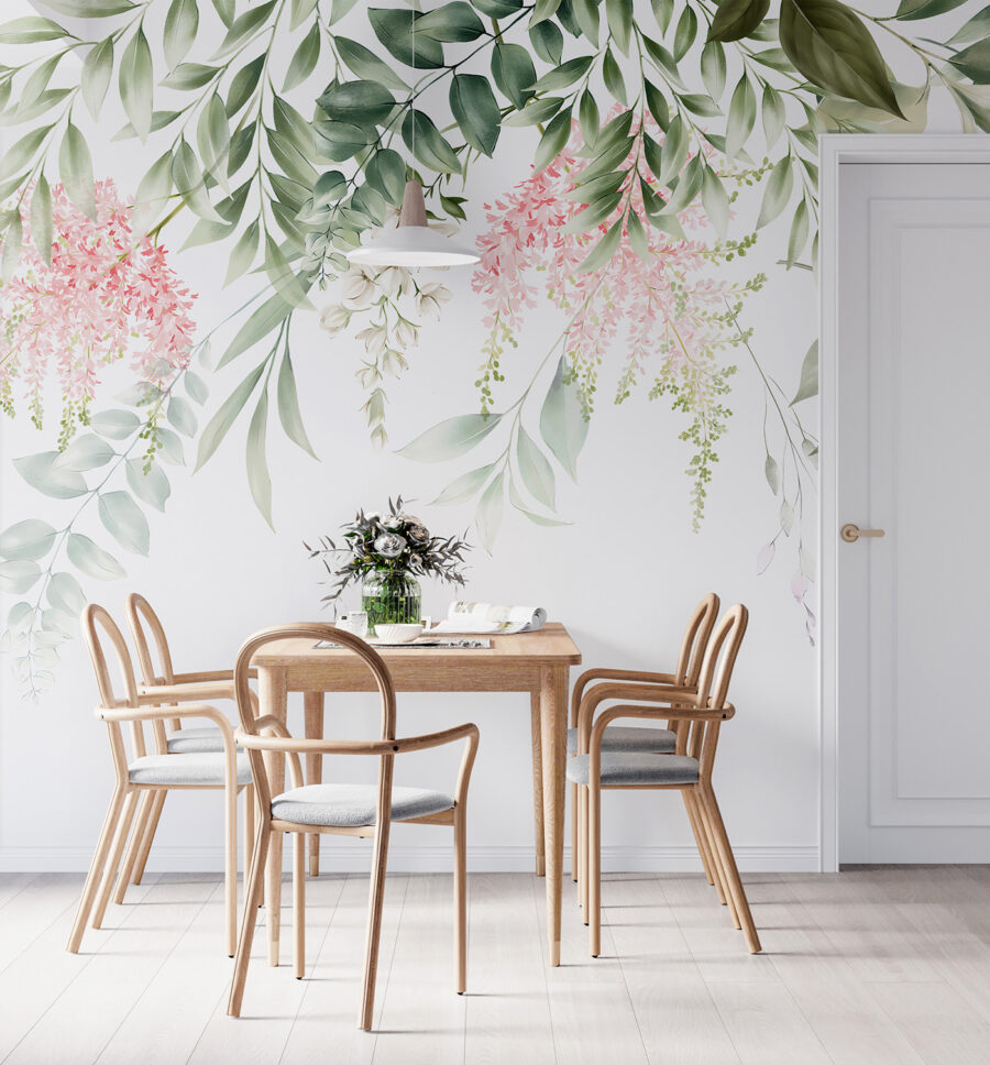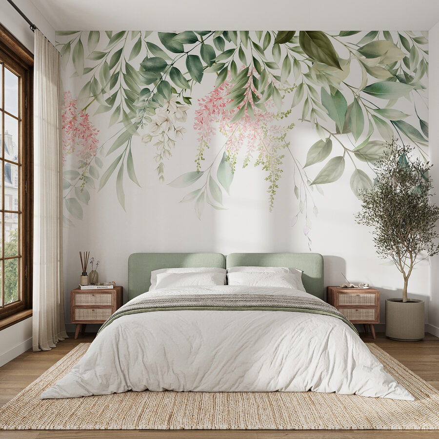 Immaginate di entrare in una stanza e di sentirvi immediatamente rasserenati da questo elegante murale floreale. Morbide tonalità rosa e verdi scendono a cascata lungo la parete, come la brezza di un giardino. È un mix perfetto, moderno ma senza tempo. Ideale per un soggiorno, una camera da letto o anche un elegante ufficio in casa. Le foglie e i fiori delicati potrebbero farvi sentire come in un giardino botanico soleggiato, anche nei giorni più piovosi. Se volete aggiungere un tocco di magia ispirata alla natura al vostro spazio, questo murale potrebbe fare al caso vostro.