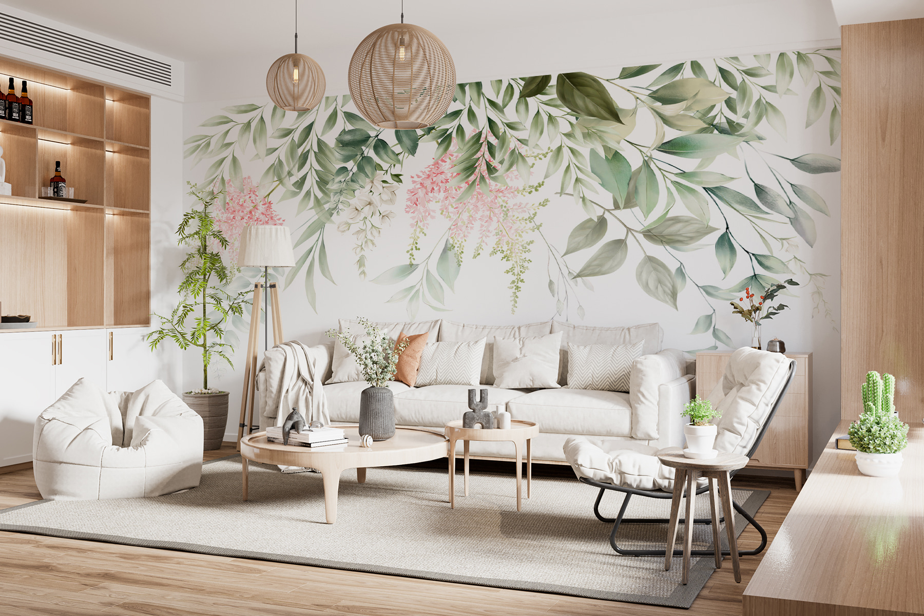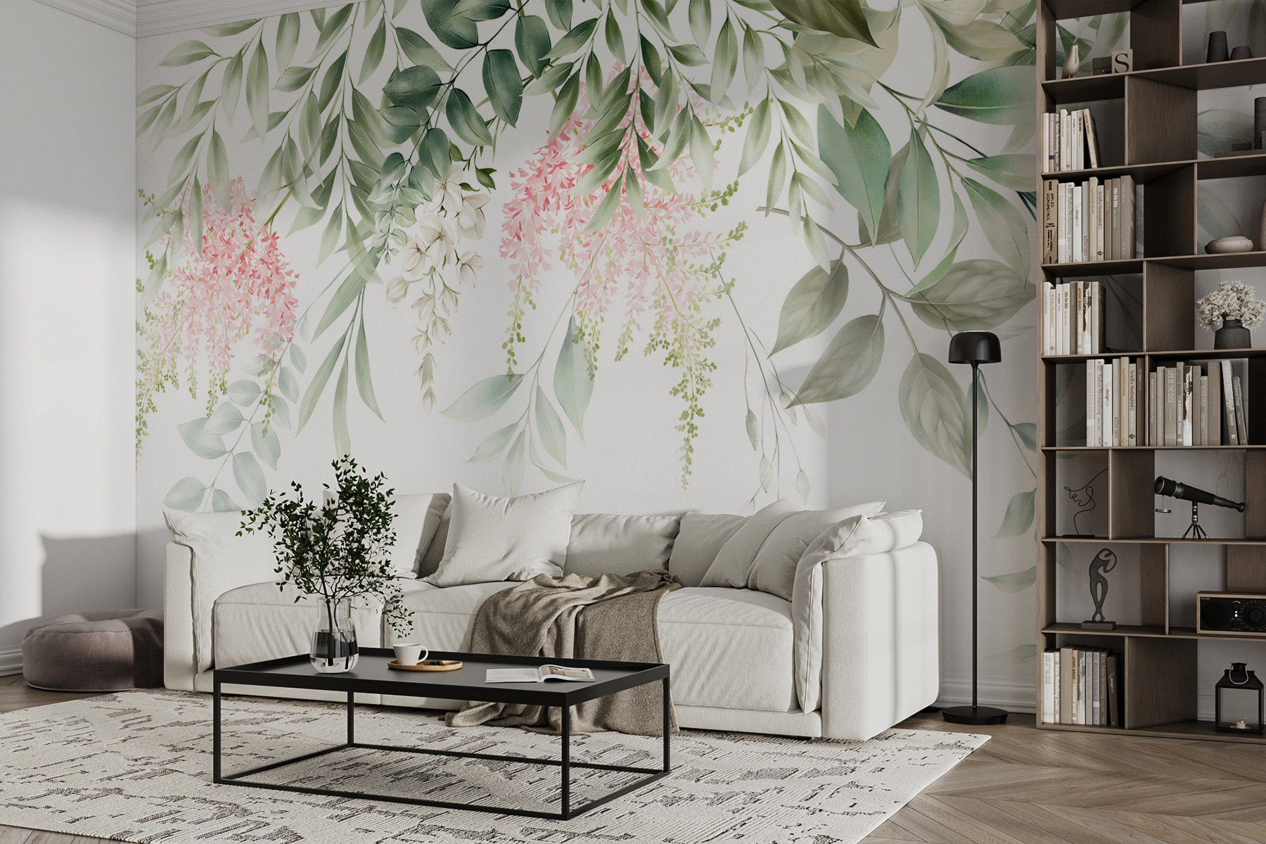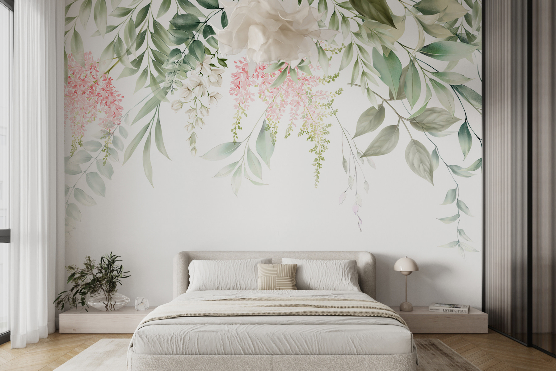 Immaginate di entrare in una stanza e di sentirvi immediatamente rasserenati da questo elegante murale floreale. Morbide tonalità rosa e verdi scendono a cascata lungo la parete, come la brezza di un giardino. È un mix perfetto, moderno ma senza tempo. Ideale per un soggiorno, una camera da letto o anche un elegante ufficio in casa. Le foglie e i fiori delicati potrebbero farvi sentire come in un giardino botanico soleggiato, anche nei giorni più piovosi. Se volete aggiungere un tocco di magia ispirata alla natura al vostro spazio, questo murale potrebbe fare al caso vostro.
