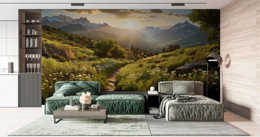 Bene, immaginate di essere nel vostro salotto, ma all’improvviso non lo siete più. Questo murale? Lo fa. È come entrare in un rifugio tranquillo, circondato da un albero rigoglioso e da maestose montagne in lontananza. Quasi si sente l’aria frizzante della montagna e il fruscio delle foglie.
