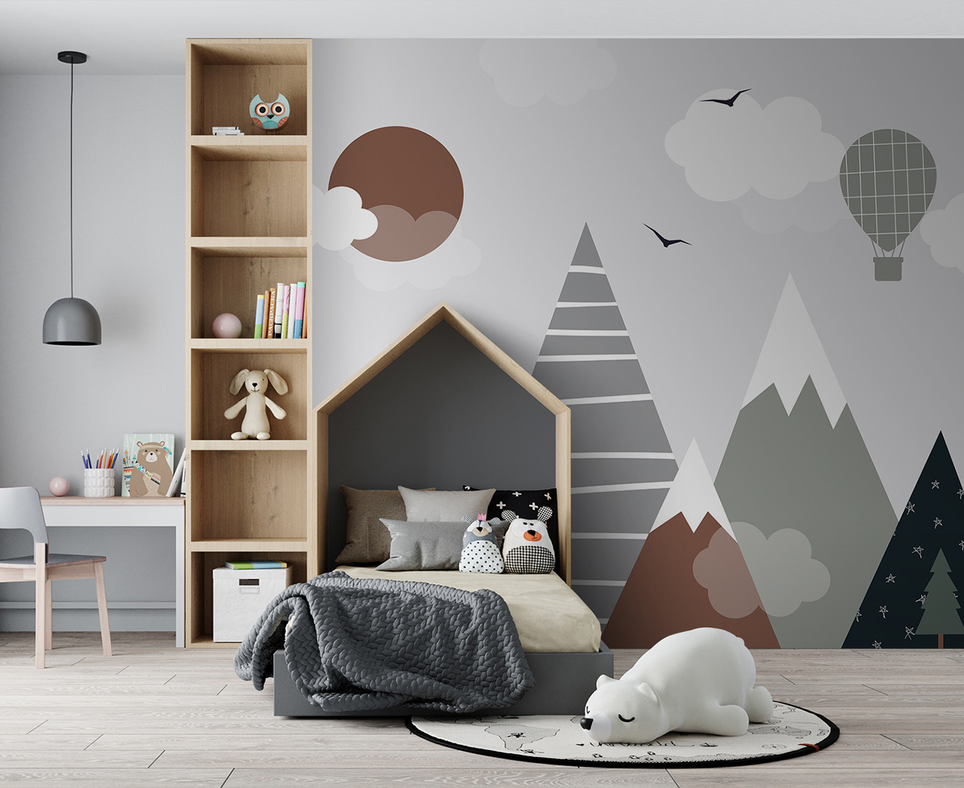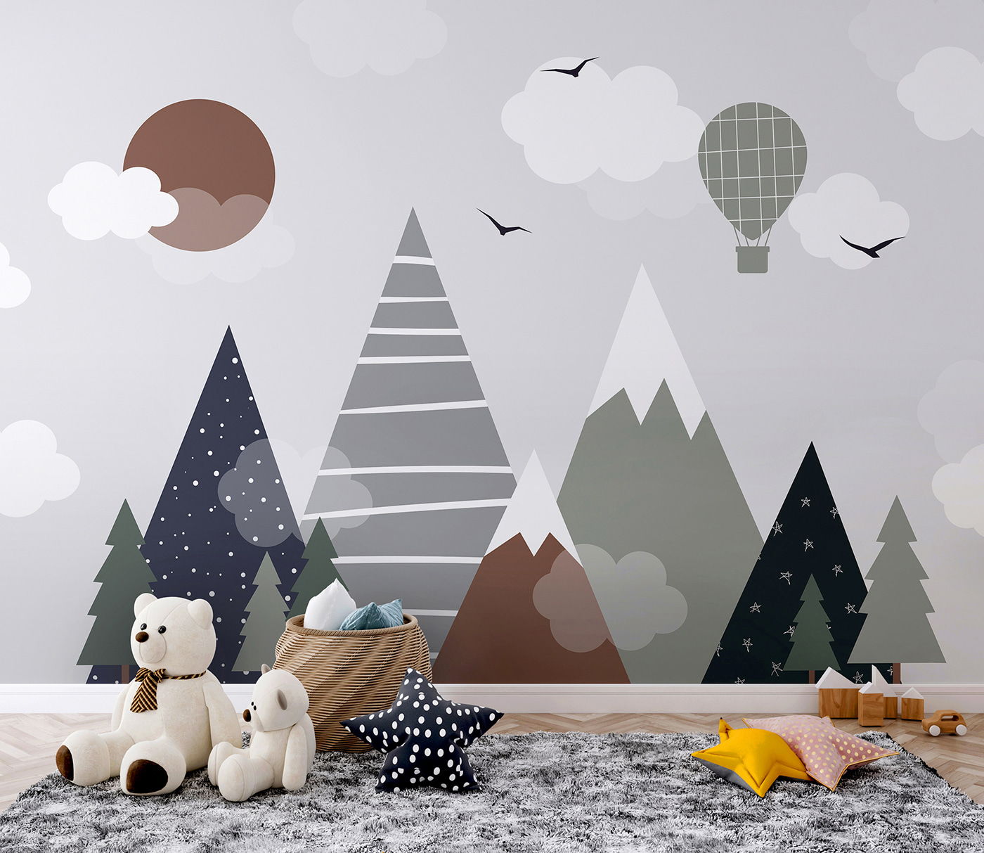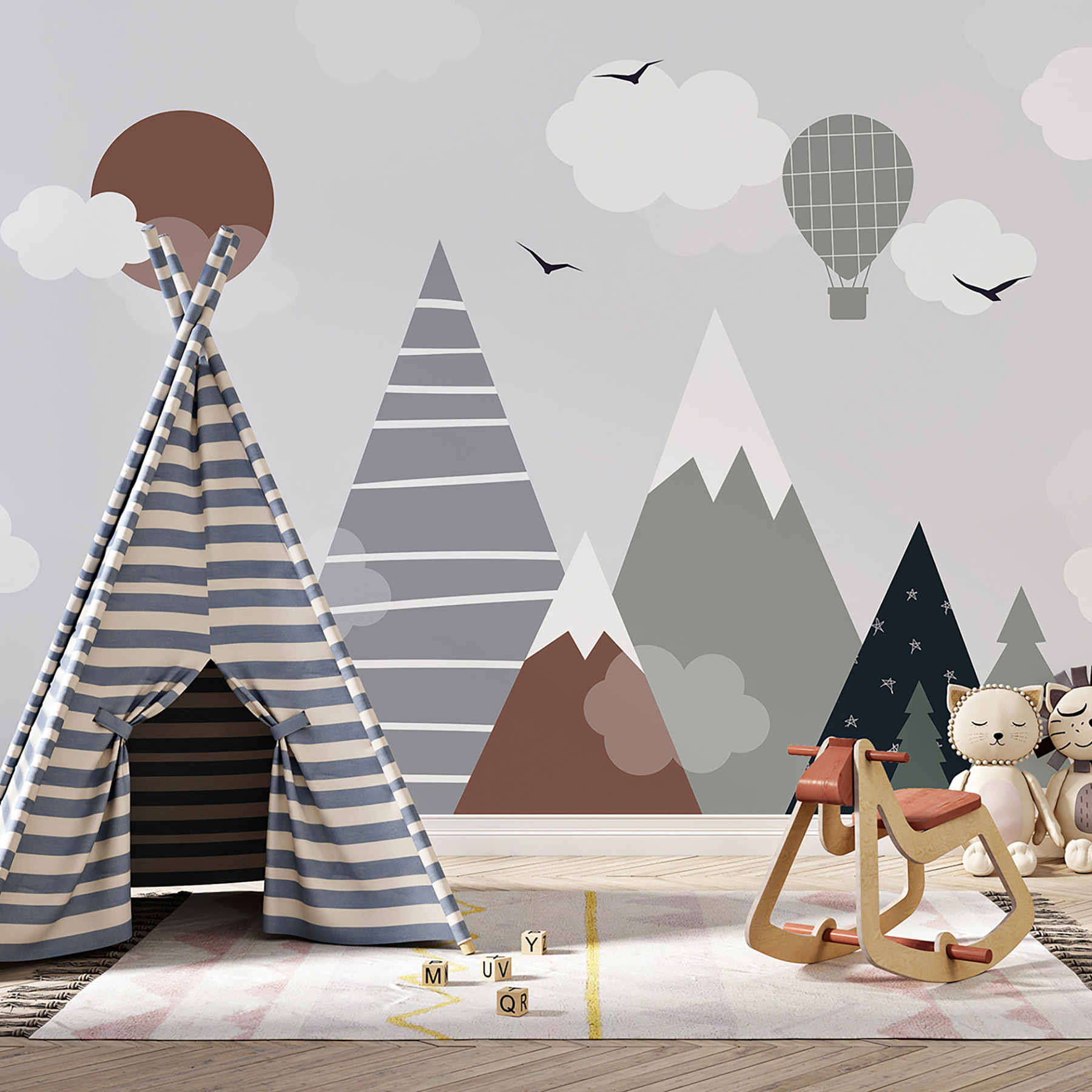 Guardate questo fantastico murale: si chiama “Cerchio marrone con nuvole bianche”. Perfetto per la camera dei bambini, soprattutto se si vuole aggiungere un tocco di fantasia al loro spazio. Immaginate di alzare lo sguardo e vedere questa scena giocosa di montagne, nuvole e una mongolfiera. Sembra quasi di entrare in un libro di fiabe: magico, vero?