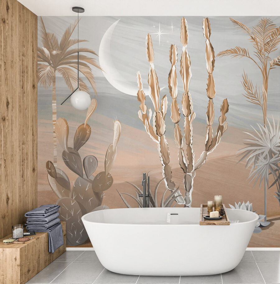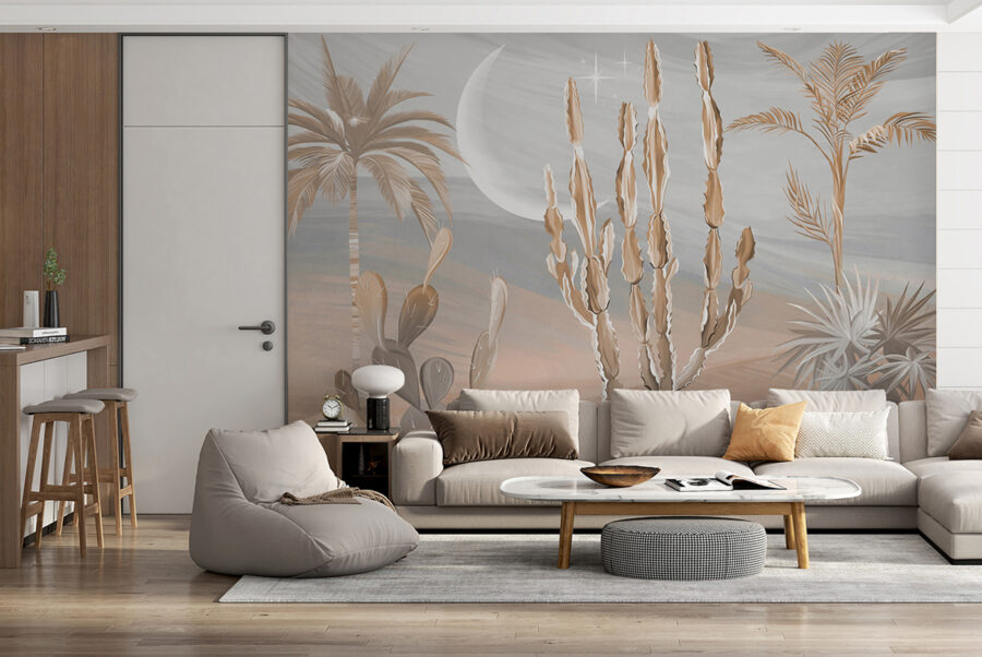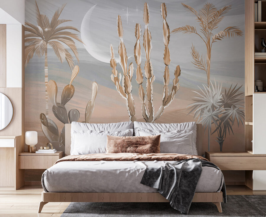 Date un’occhiata a questo fantastico murale! Immaginate di portare un pezzo di deserto nel vostro salotto: cactus, palme e un paesaggio da sogno. È come entrare in un’oasi serena senza il caldo torrido e le piante spinose. Perfetto per aggiungere un tocco di vagabondaggio a qualsiasi spazio.